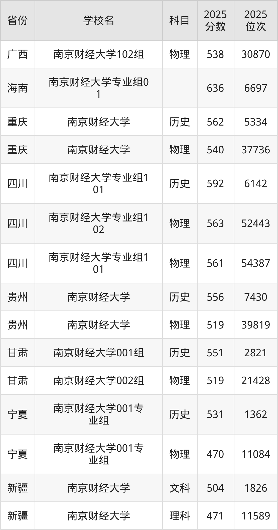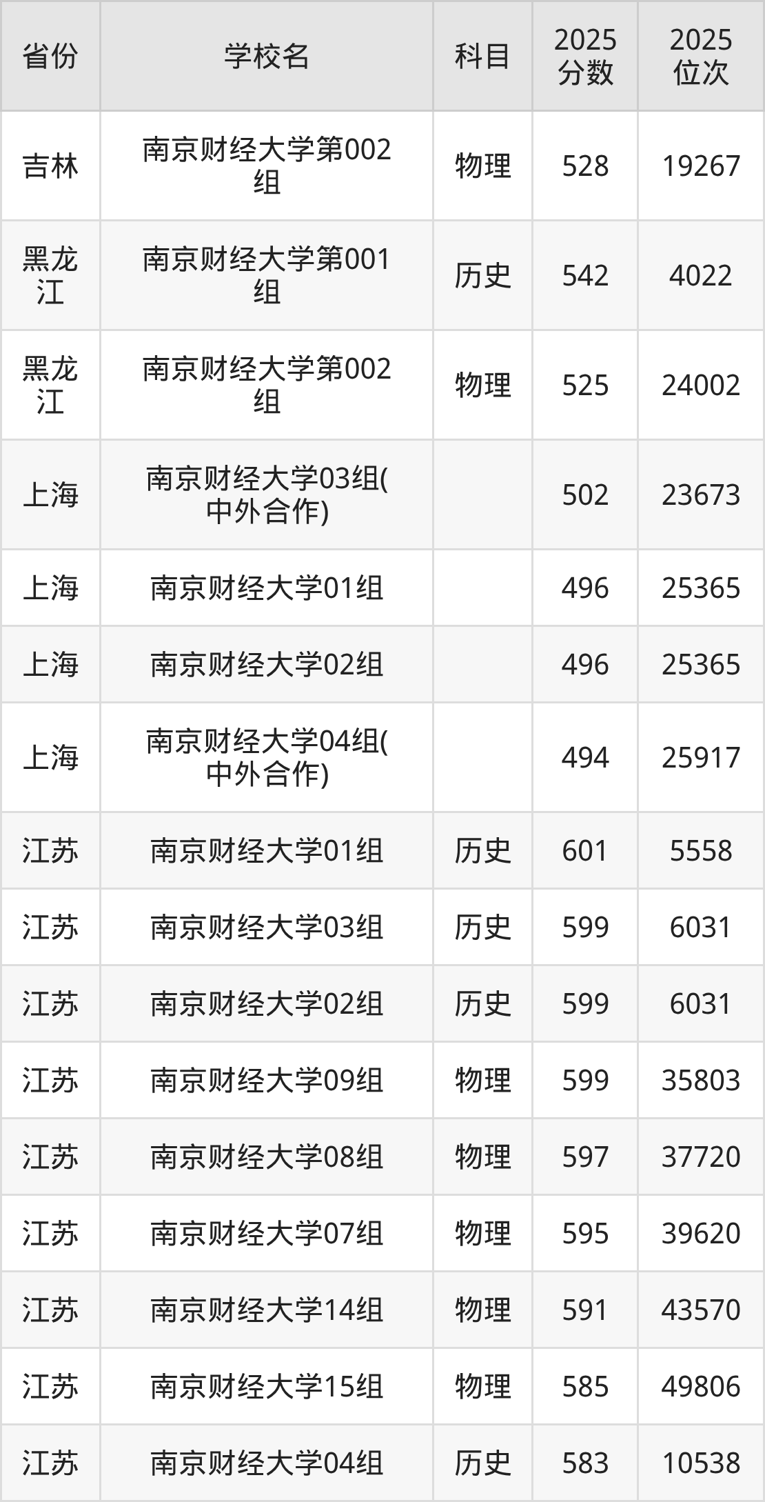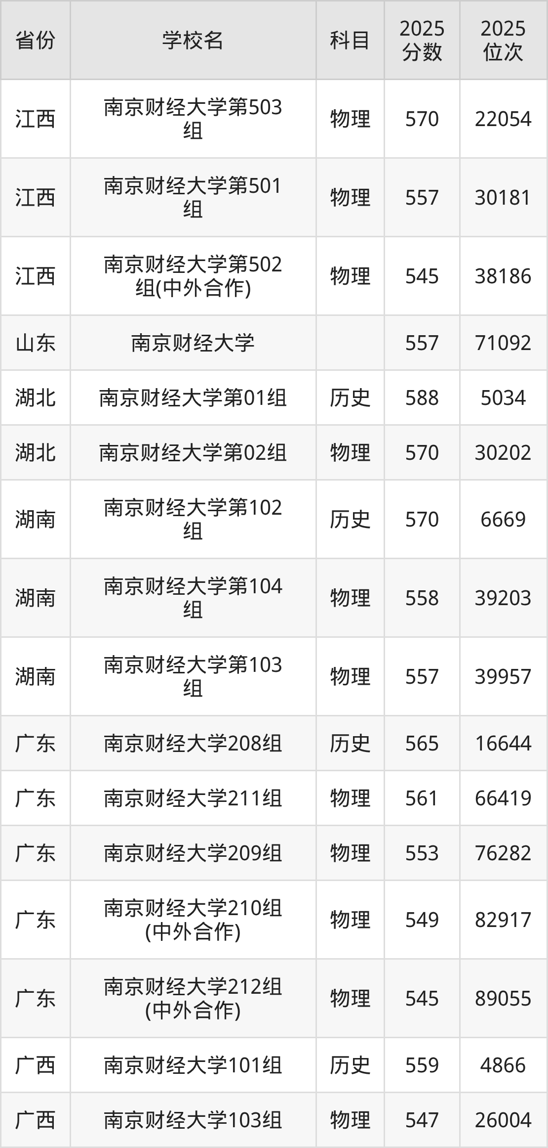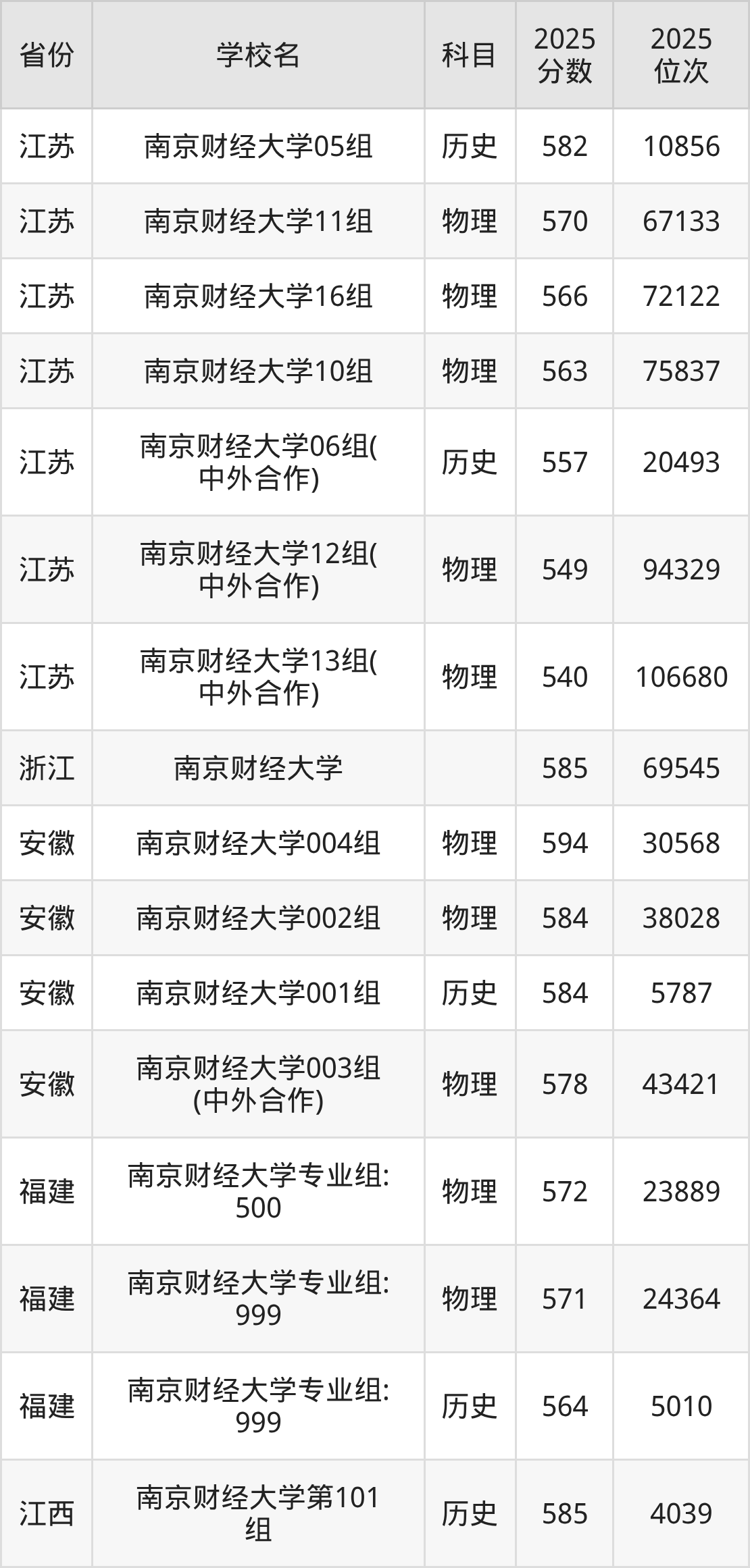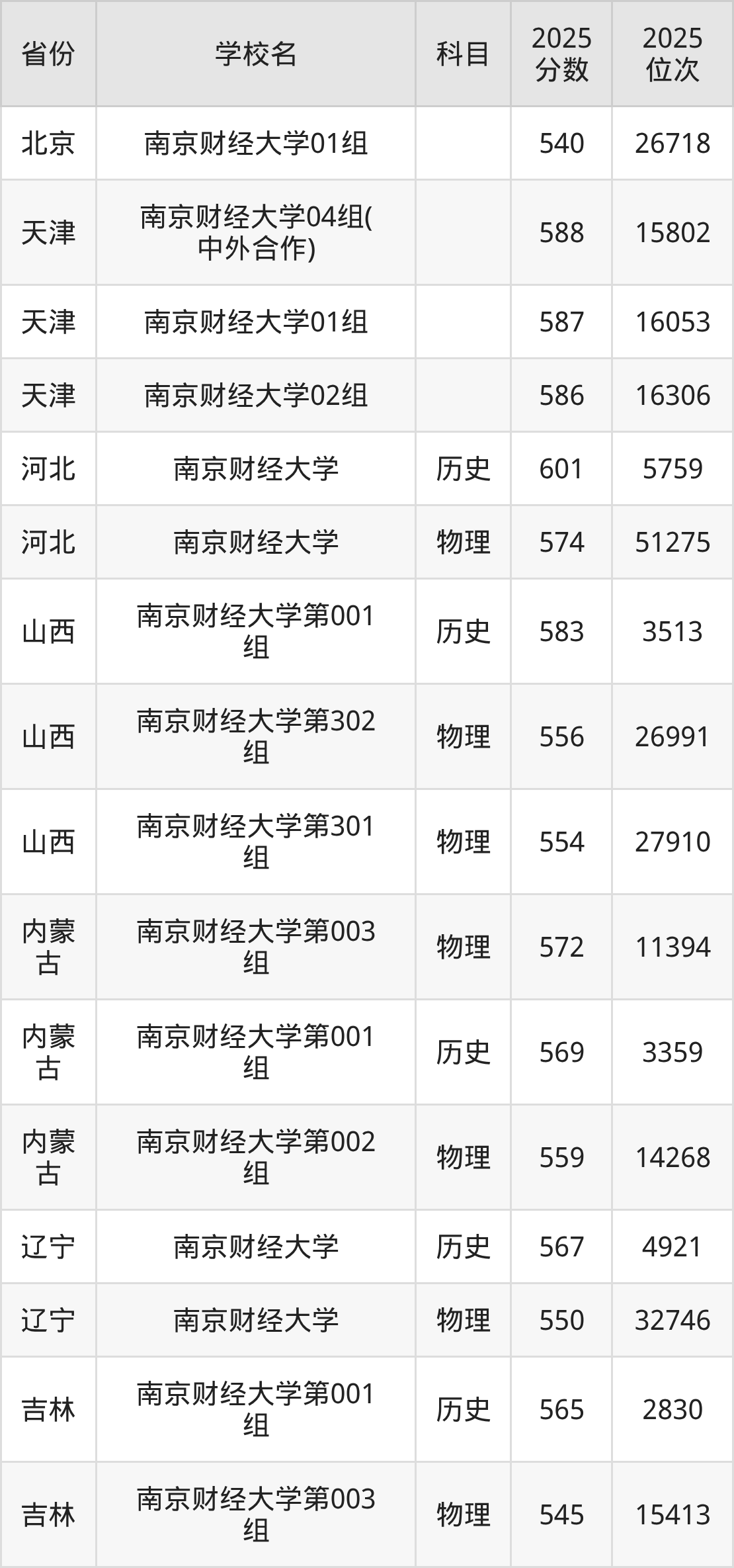 下面是南京财经大学2025年录取分数线一览表: