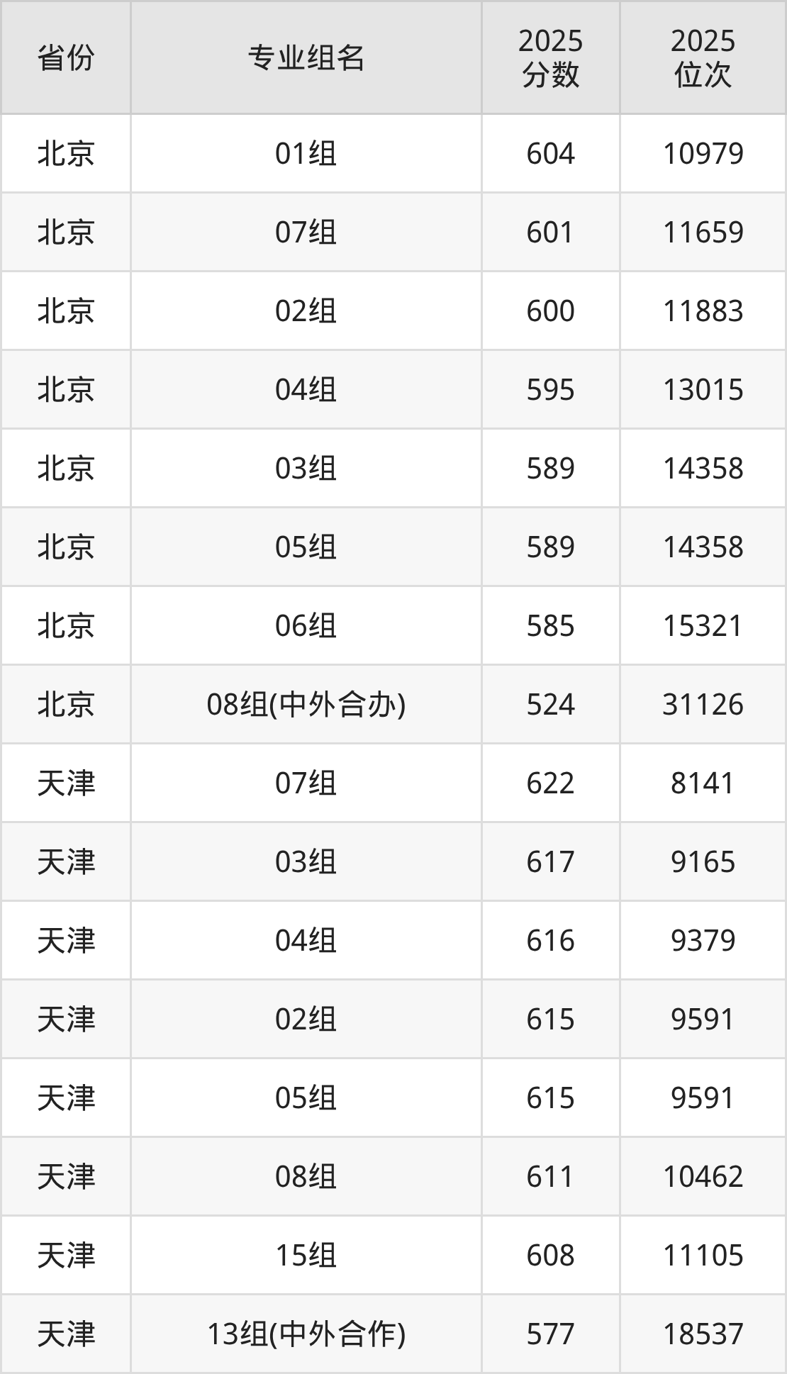 2025年北京体育大学在北京市内录取最低分数线是524分,录取最低的是08组(中外合办);录取分数线最高是604分,对应的是01组。