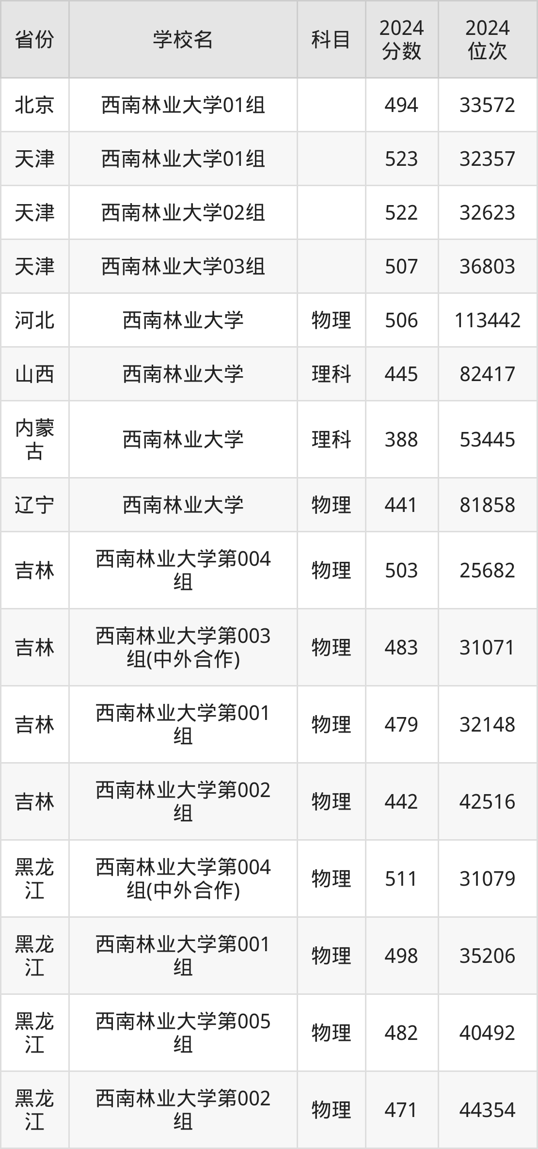 下面是西南林业大学2024年录取分数线一览表: