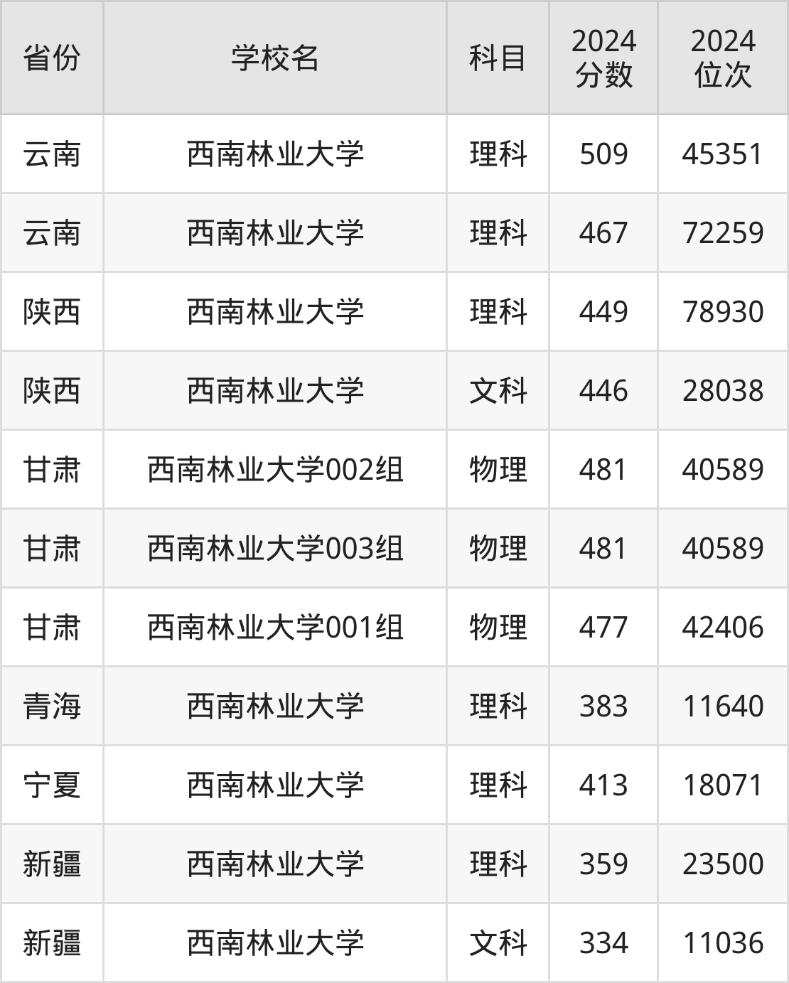 2024年西南林业大学在云南省内录取最低分数线是467分,录取最低的是理科;录取分数线最高是556分,对应的是文科。