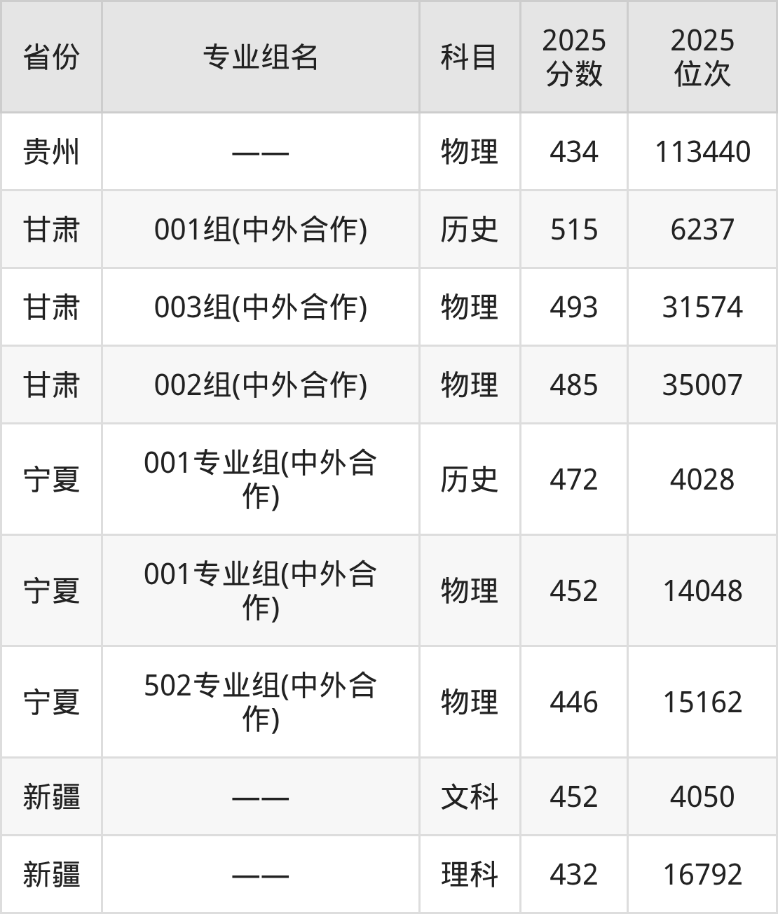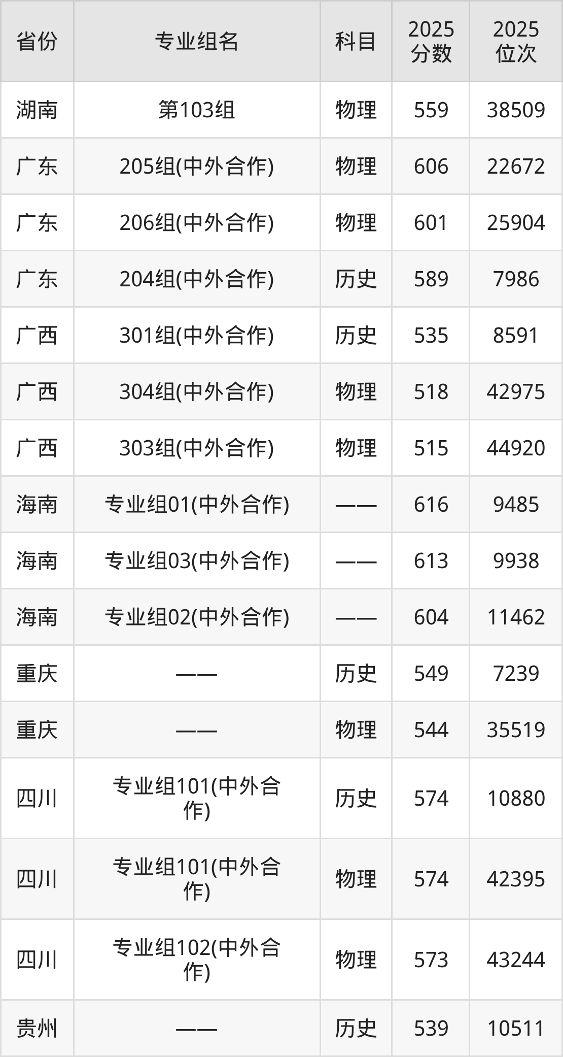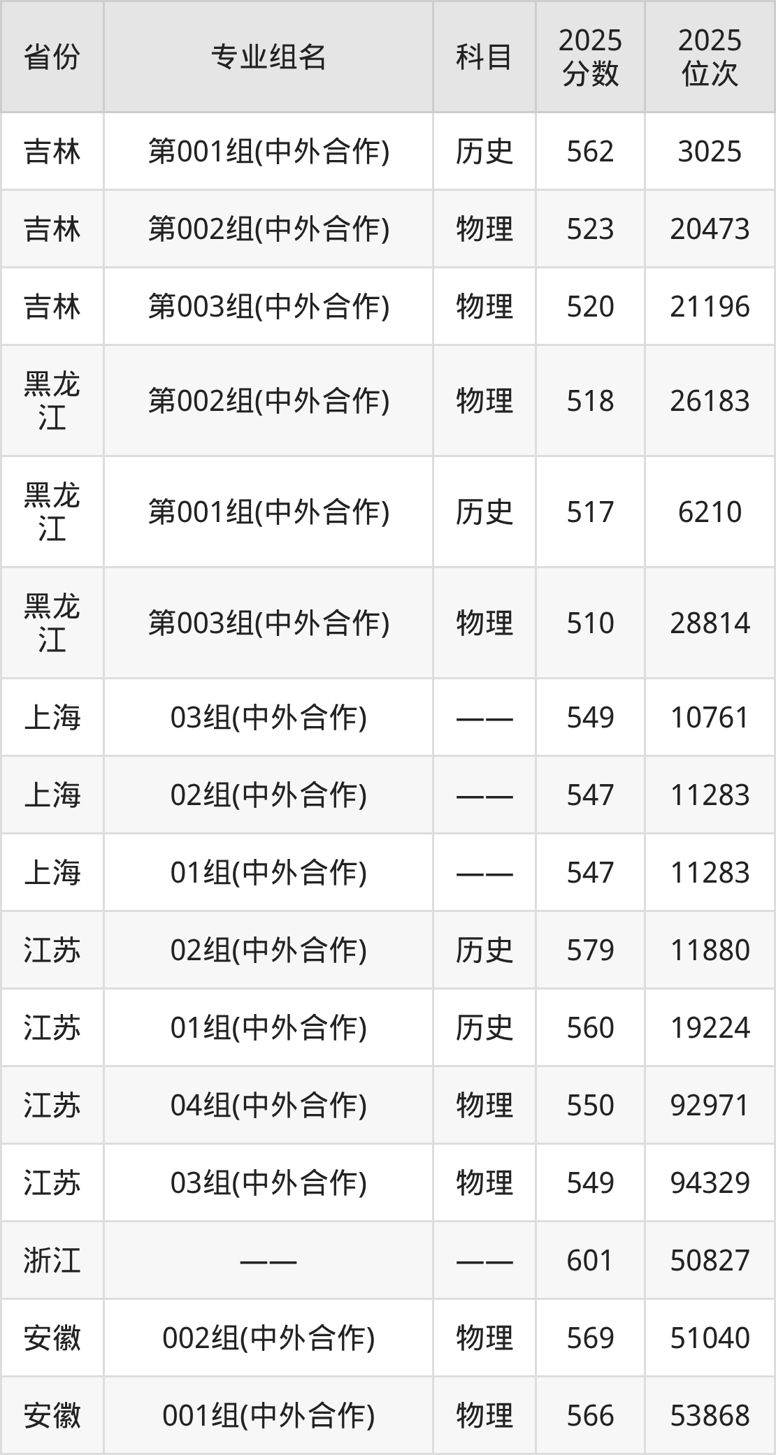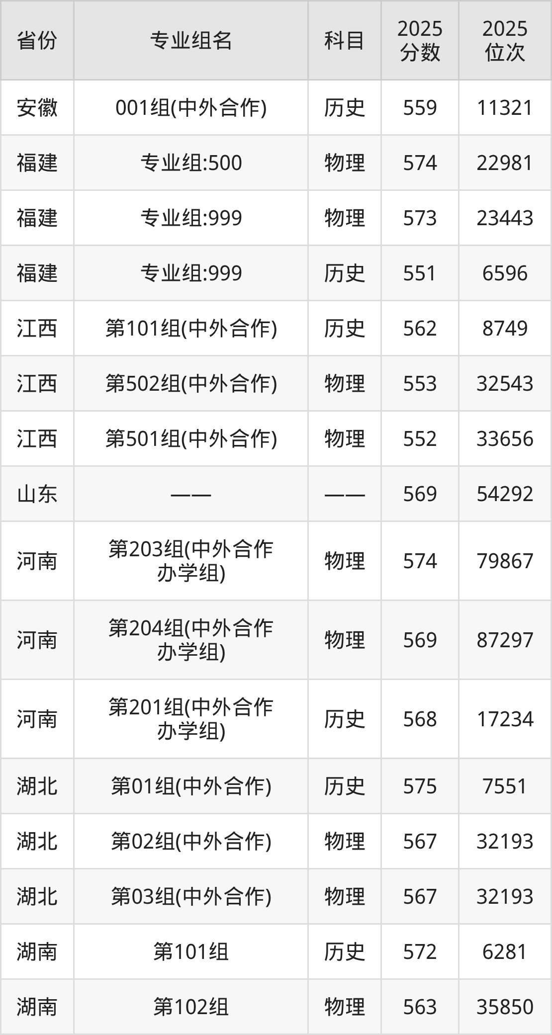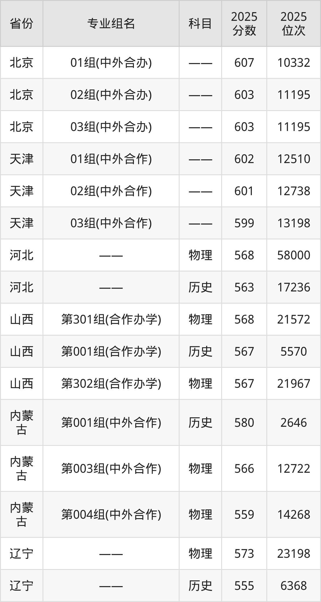 下面是西交利物浦大学2025年录取分数线一览表: