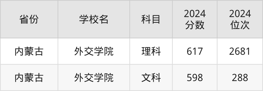 2024年外交学院在北京市外录取分数线范围是598分到617分,录取最低的是内蒙古(文科)。多数地区都需要600分以上才能考上外交学院,600分以下能考上外交学院的有内蒙古等地。