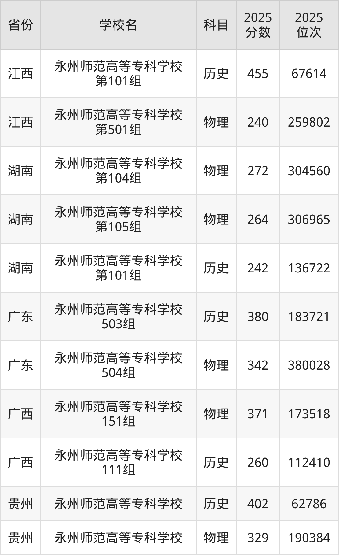 下面是永州师范高等专科学校2025年录取分数线一览表:
