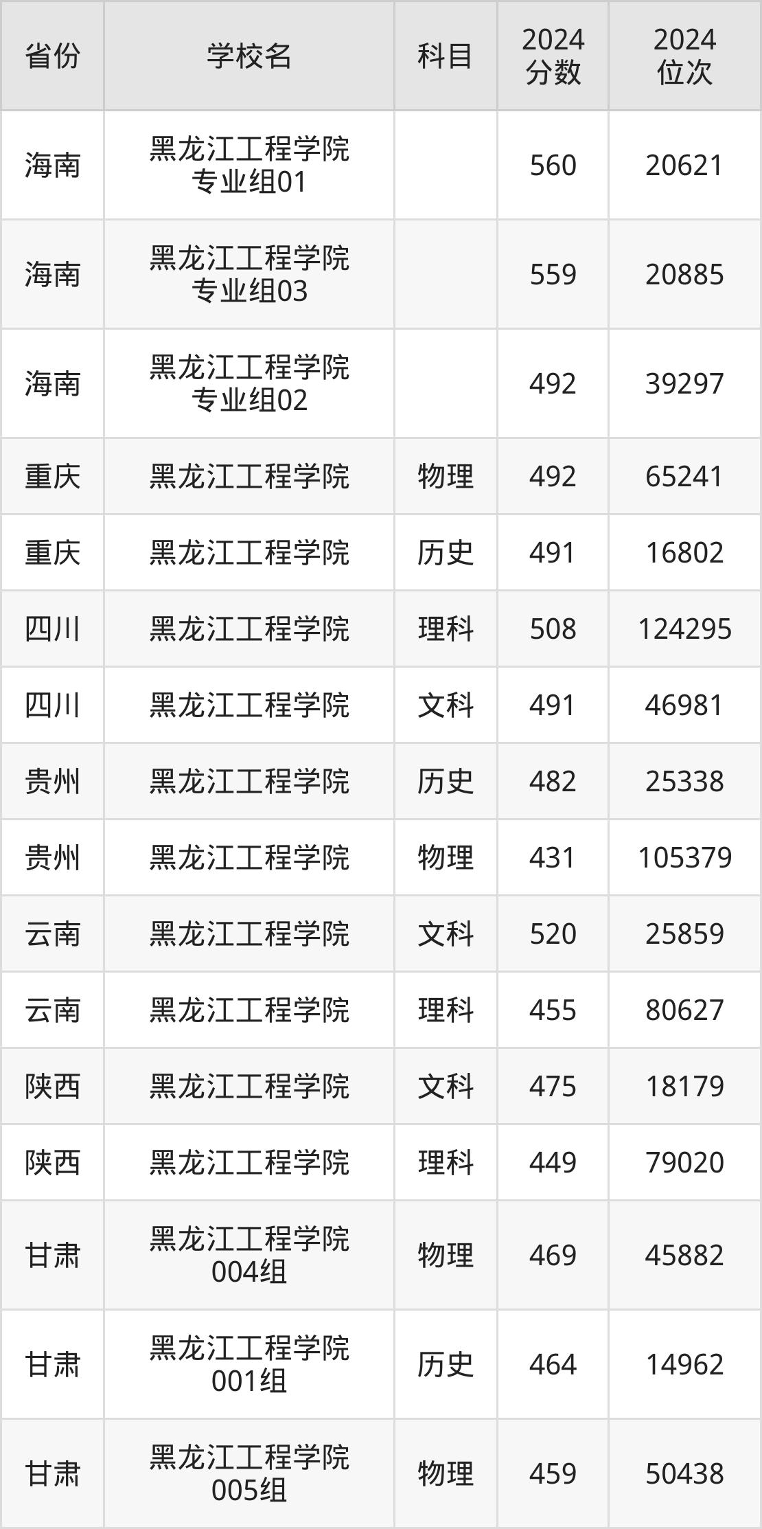 由于全国数据较多,因此本文仅展示黑龙江工程学院省内近一年录取分数线汇总。