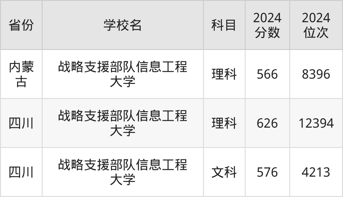 下面是中国人民解放军战略支援部队信息工程大学2024年录取分数线一览表: