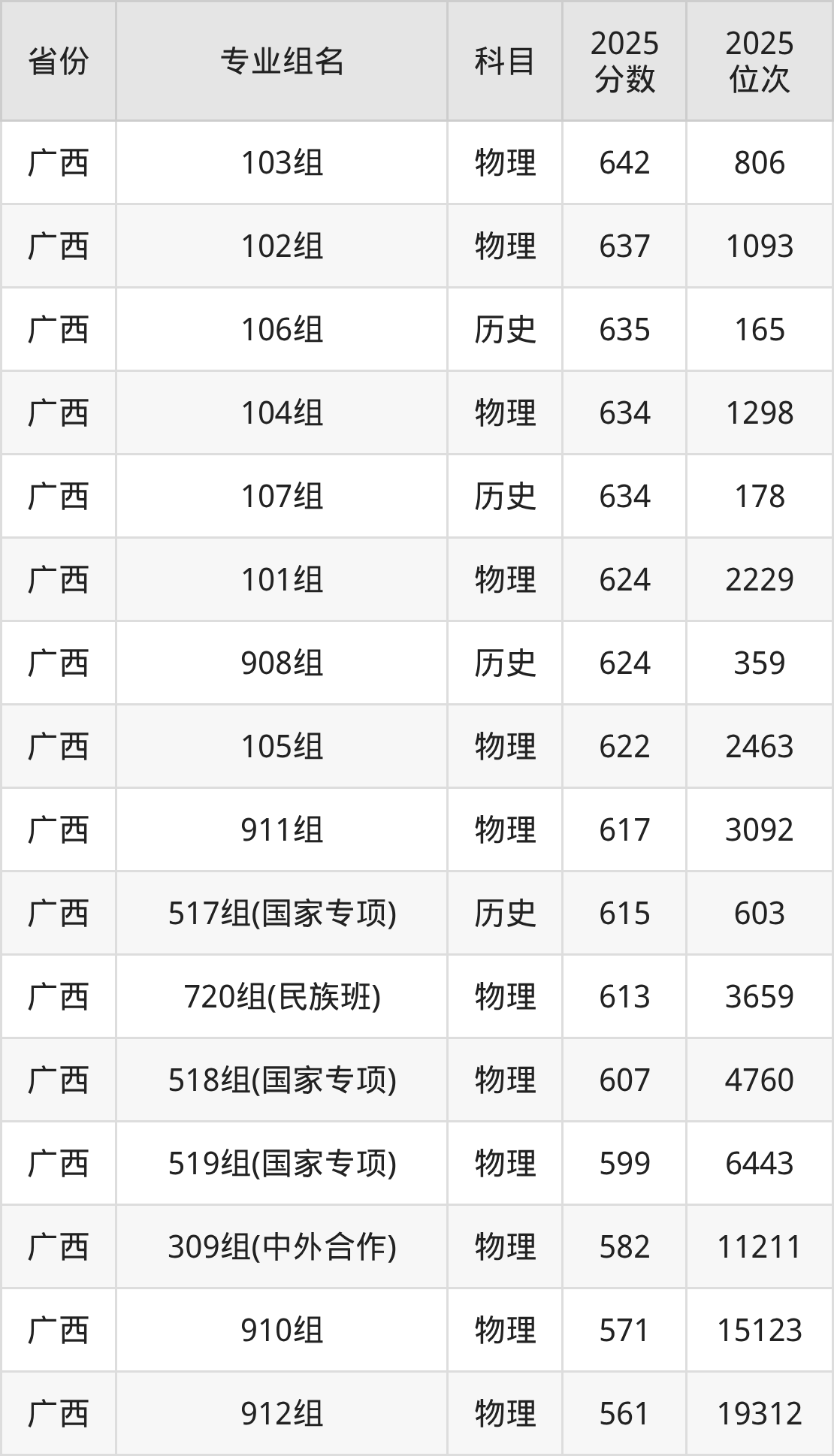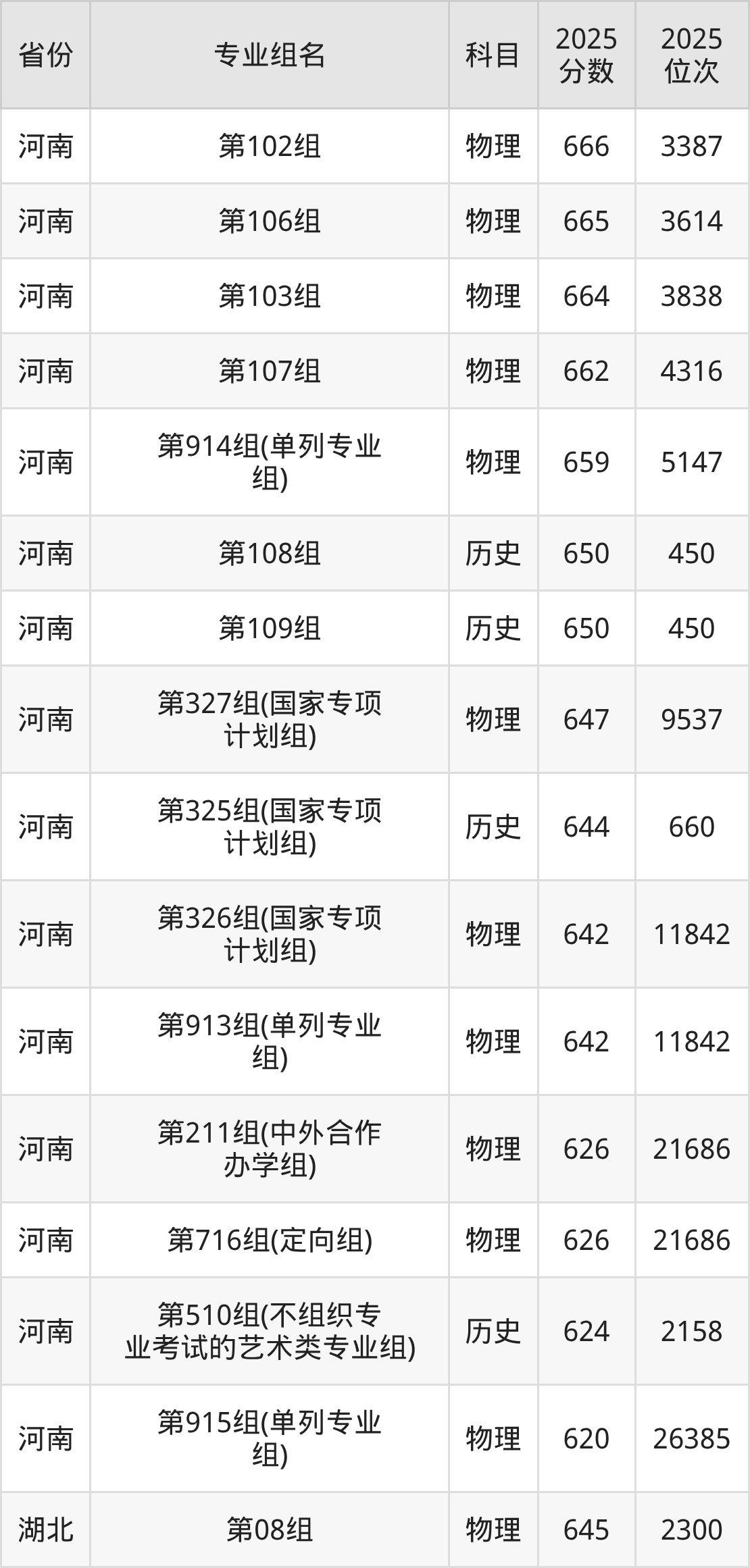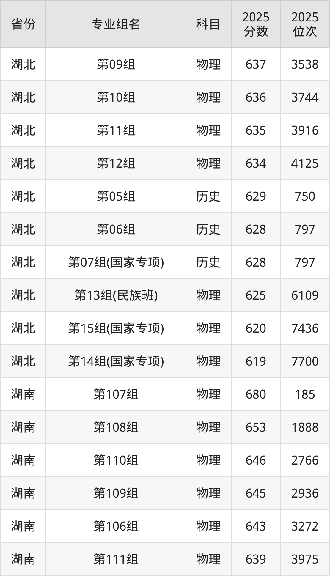物理类:第08组 645分、第09组 637分、第10组 636分、第11组 635分、第12组 634分、第13组(民族班) 625分、第15组(国家专项) 620分、第14组(国家专项) 619分。