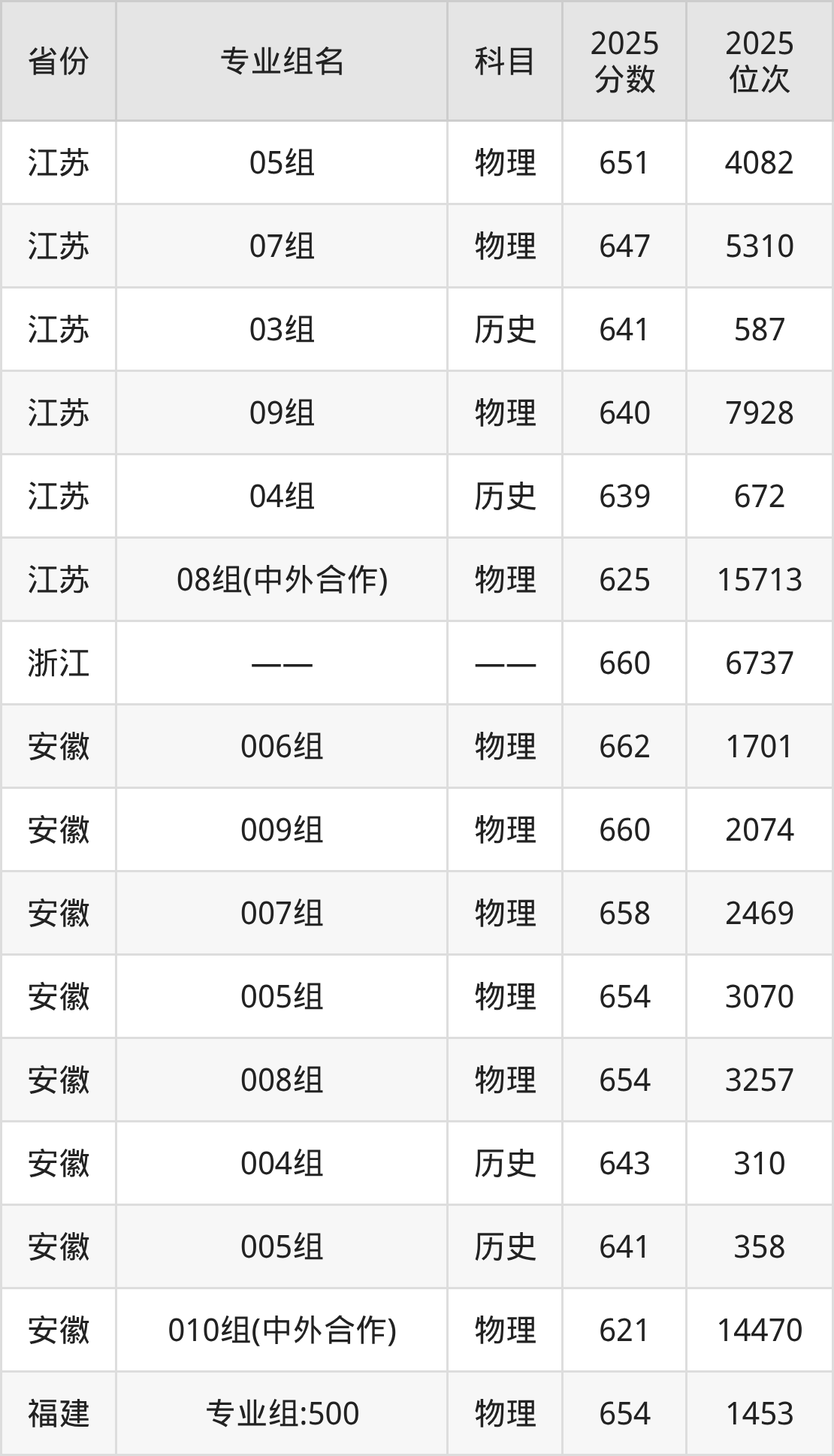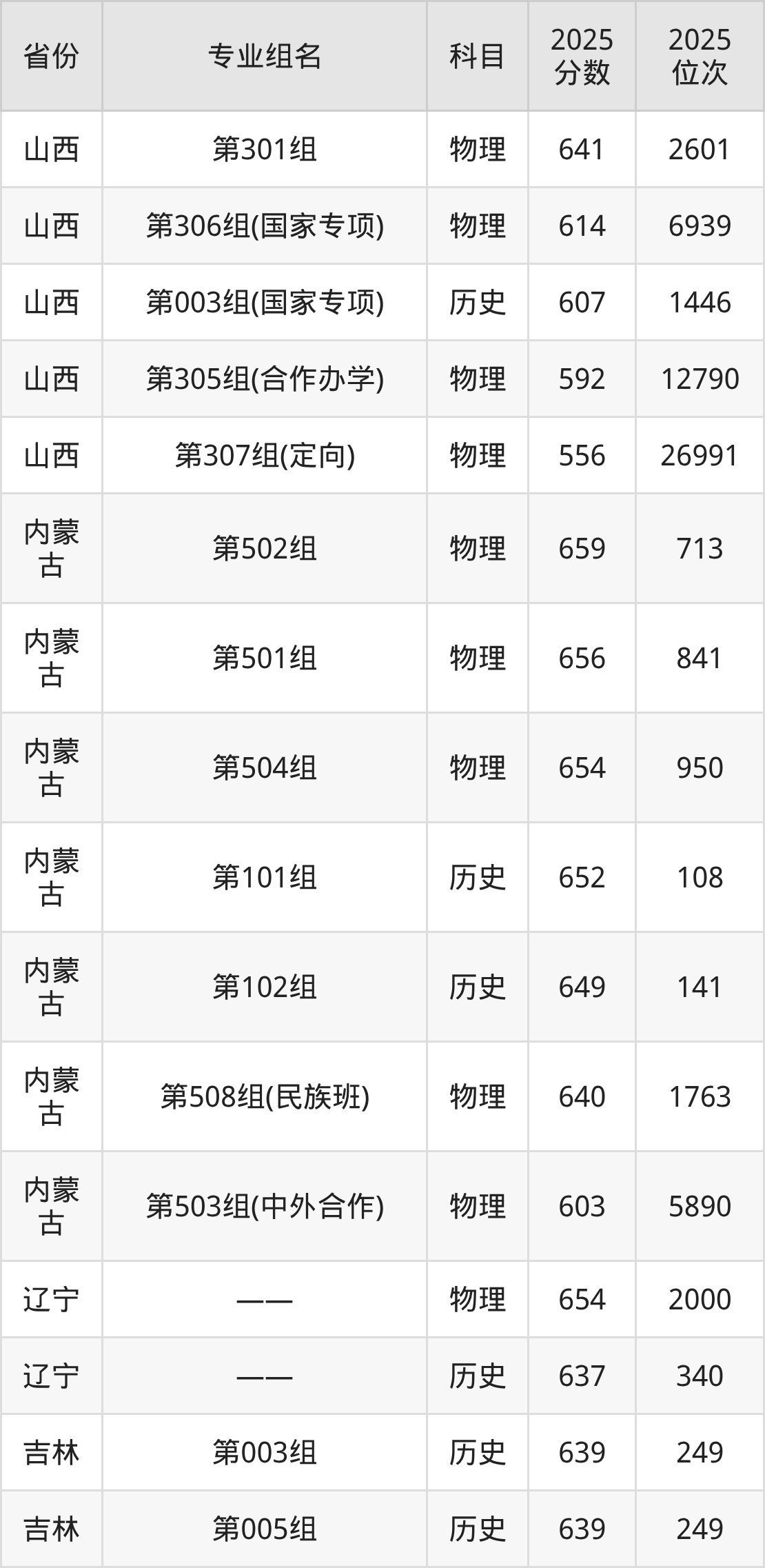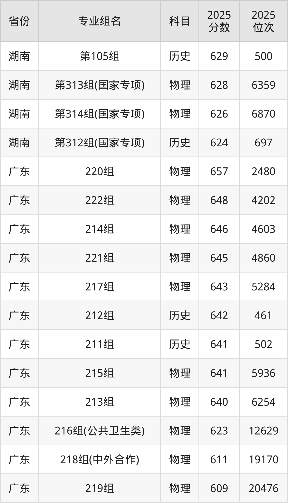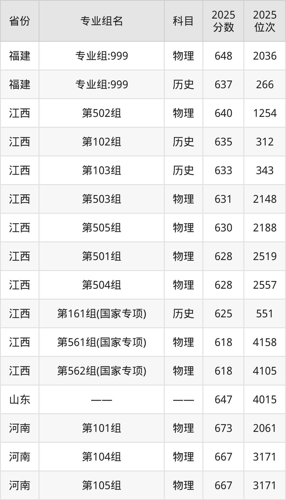 物理类:第08组 645分、第09组 637分、第10组 636分、第11组 635分、第12组 634分、第13组(民族班) 625分、第15组(国家专项) 620分、第14组(国家专项) 619分。