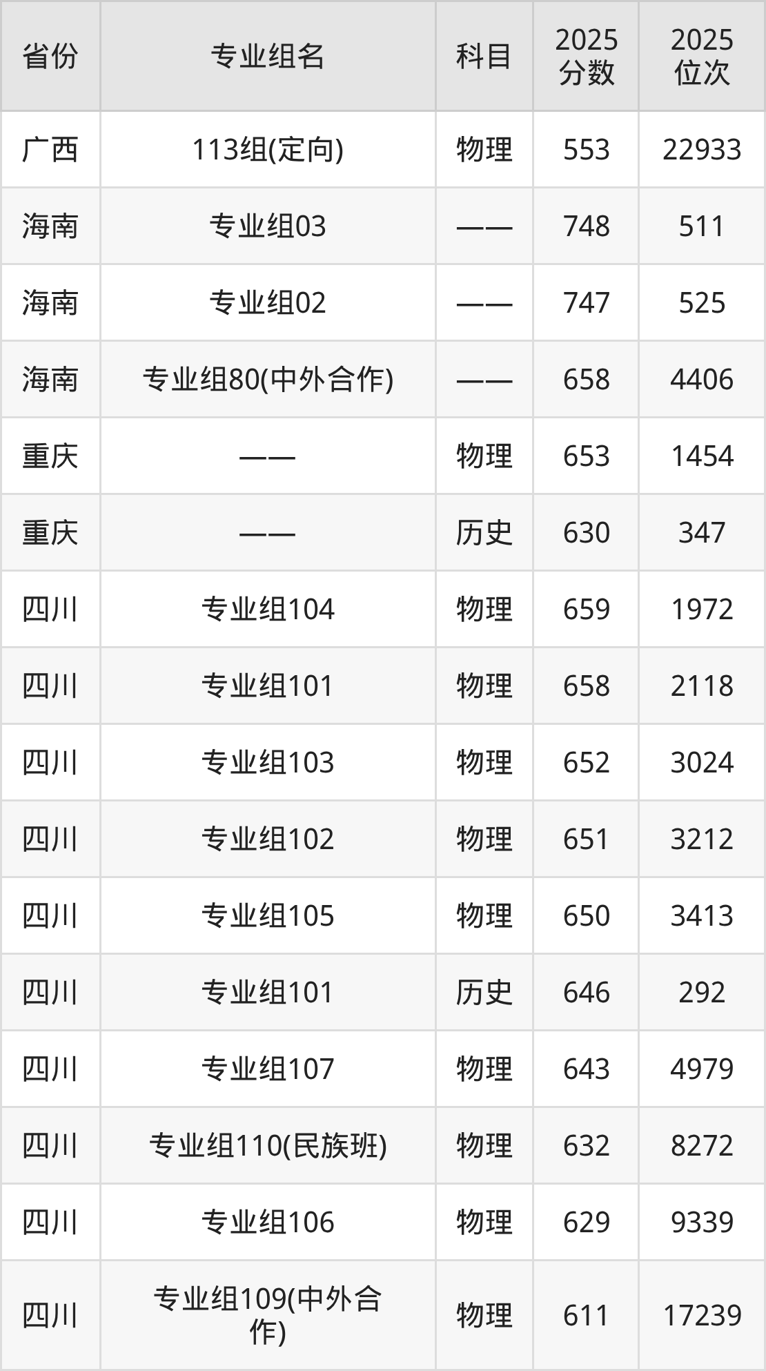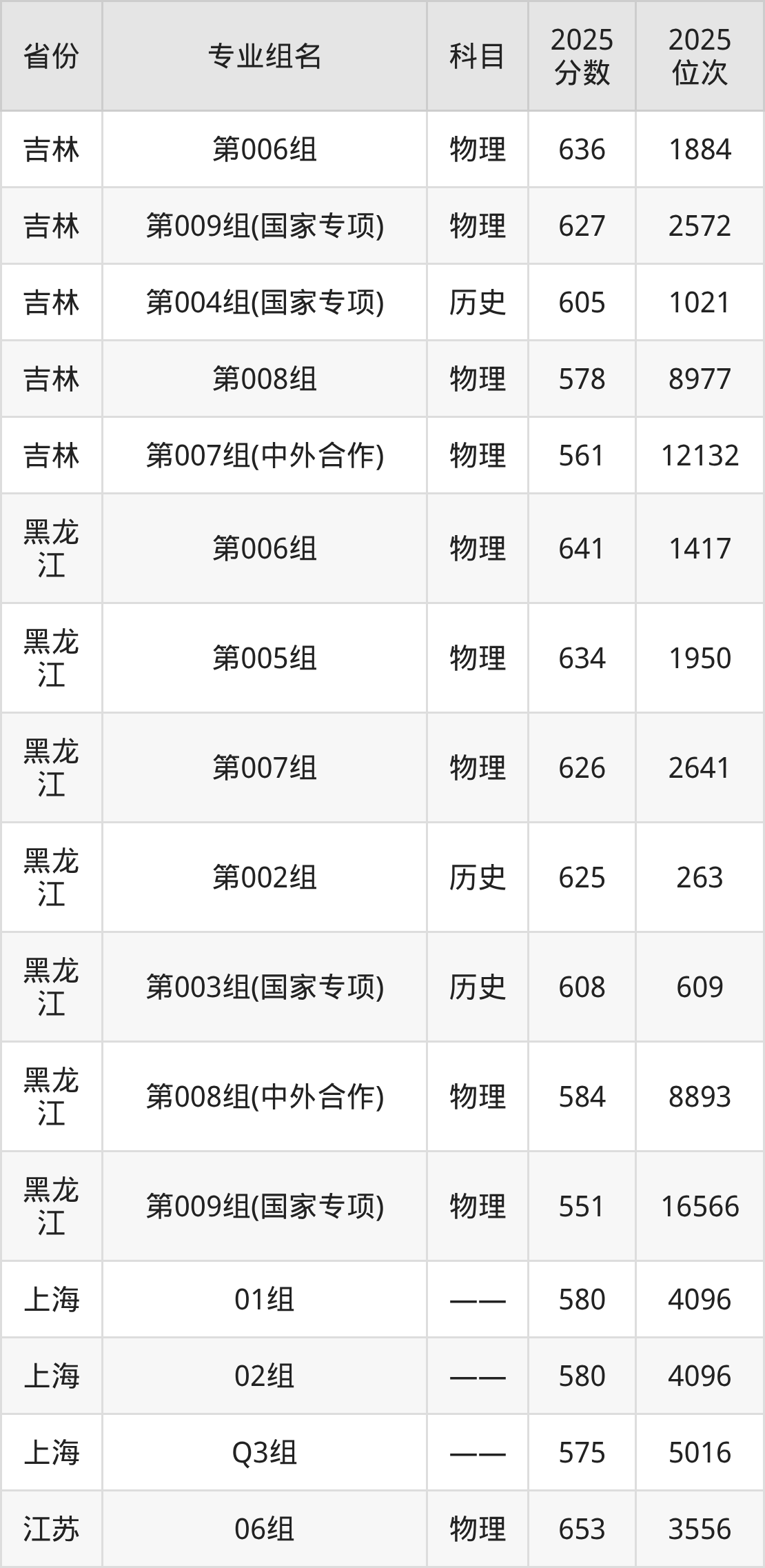 物理类:第09组 653分、第12组 649分、第11组 647分、第10组 644分、第08组 643分、第06组 641分、第14组(民族班) 635分、第13组(国家专项) 627分、第07组(国家专项) 623分。
