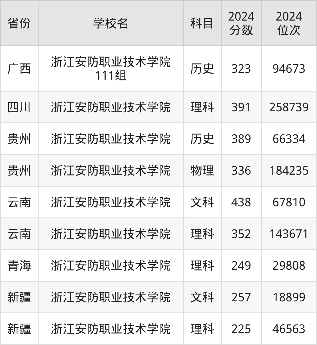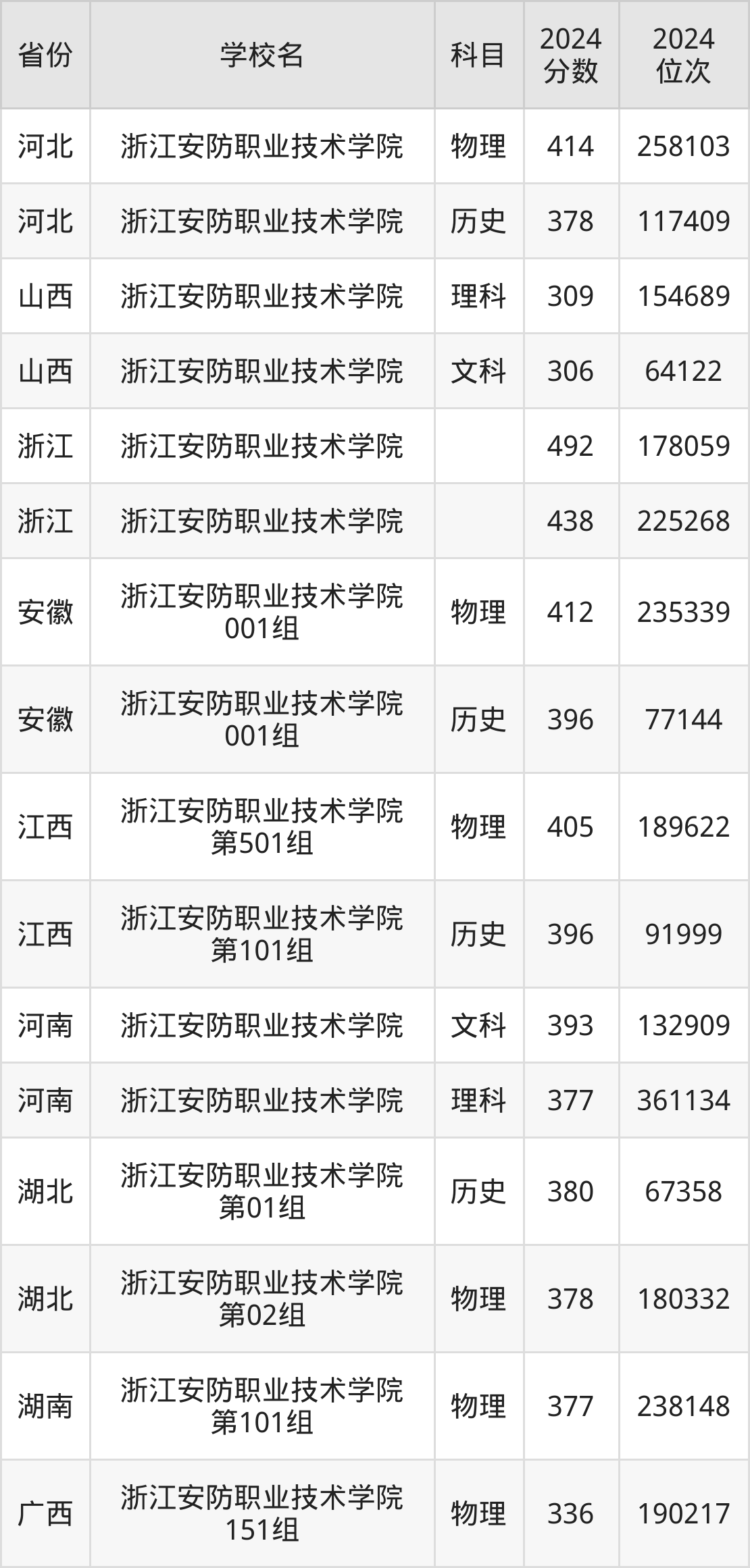 下面是浙江安防职业技术学院2024年录取分数线一览表:
