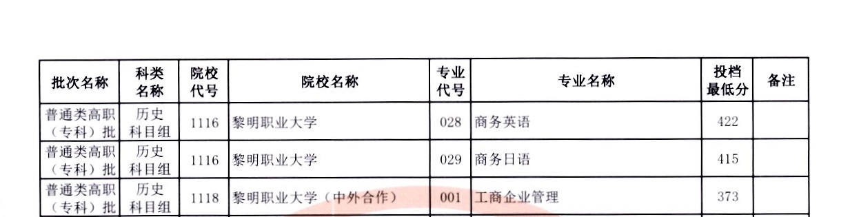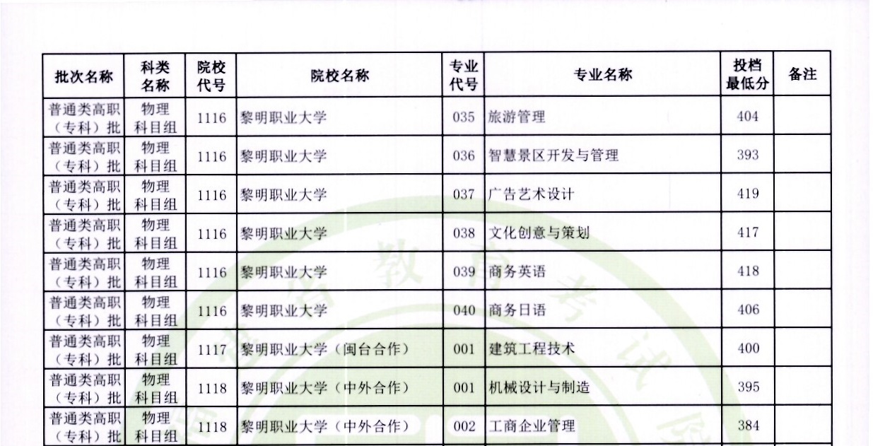 (1)黎明职业大学:工科专业普遍400+分(工业设计417分),商贸类380分左右