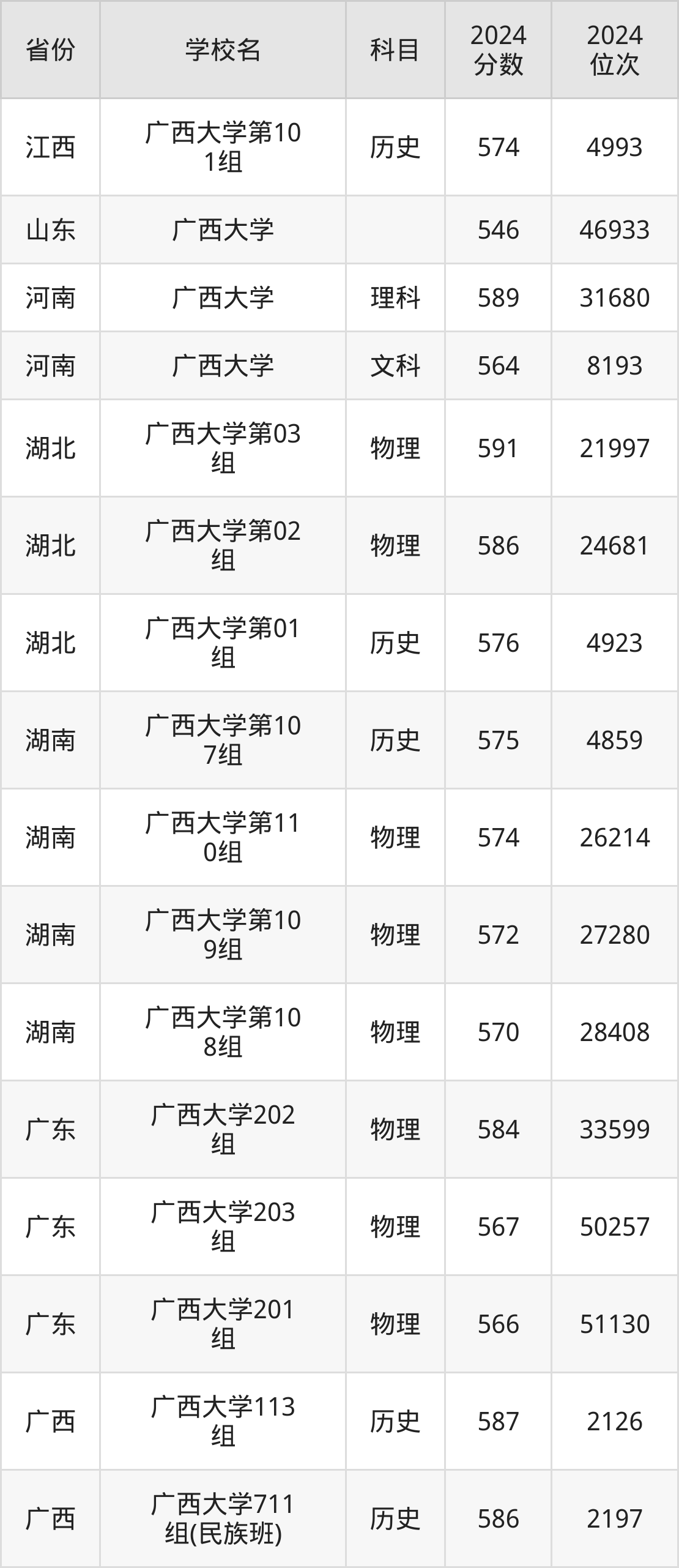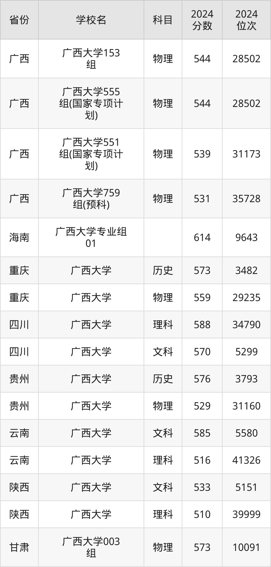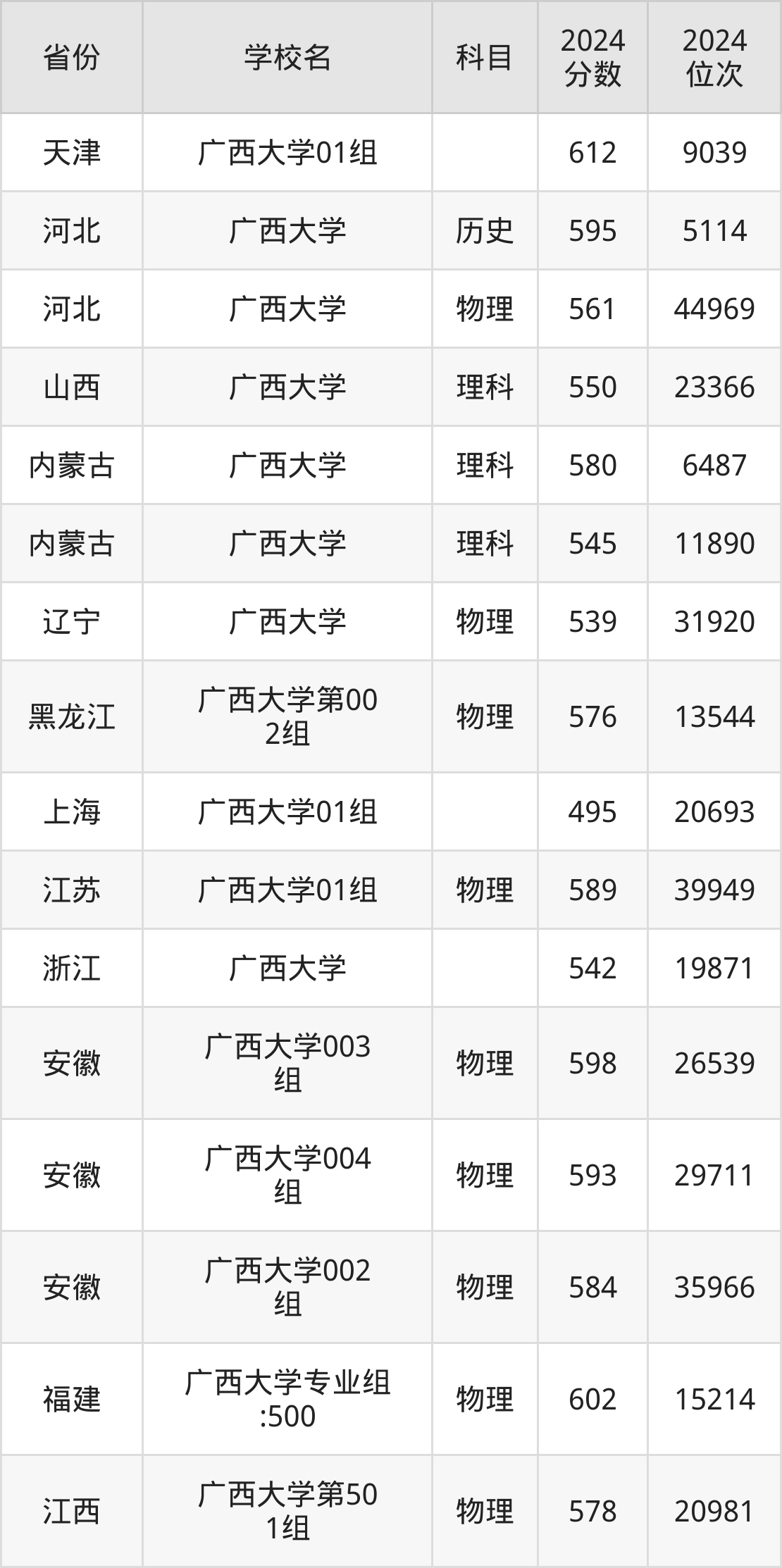 由于全国数据较多,因此本文仅展示广西大学壮族自治区内近一年录取分数线汇总。