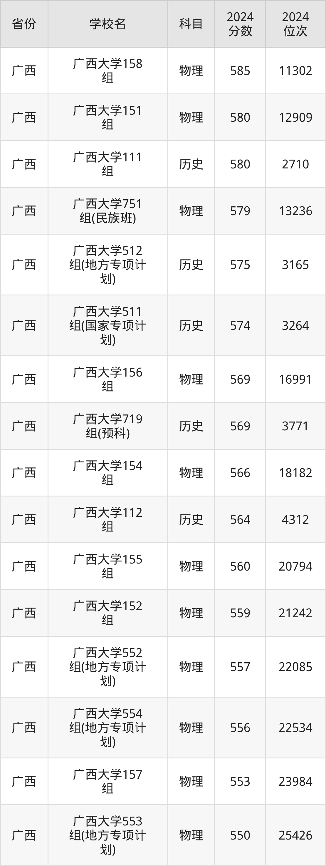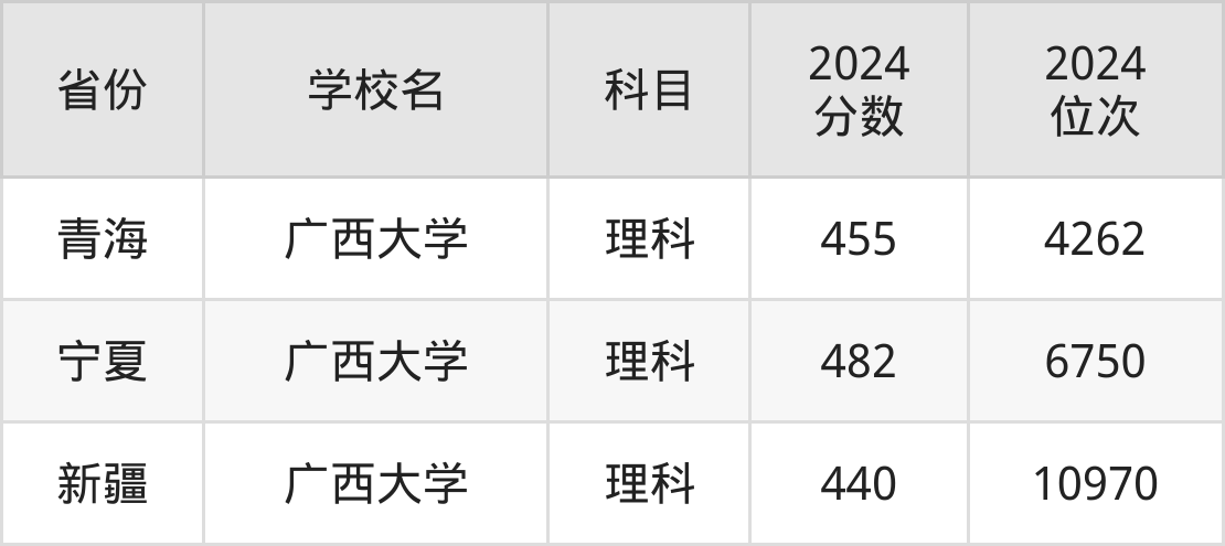 以2024年数据作为参考依据,整理广西壮族自治区内、壮族自治区外考广西大学要多少分。