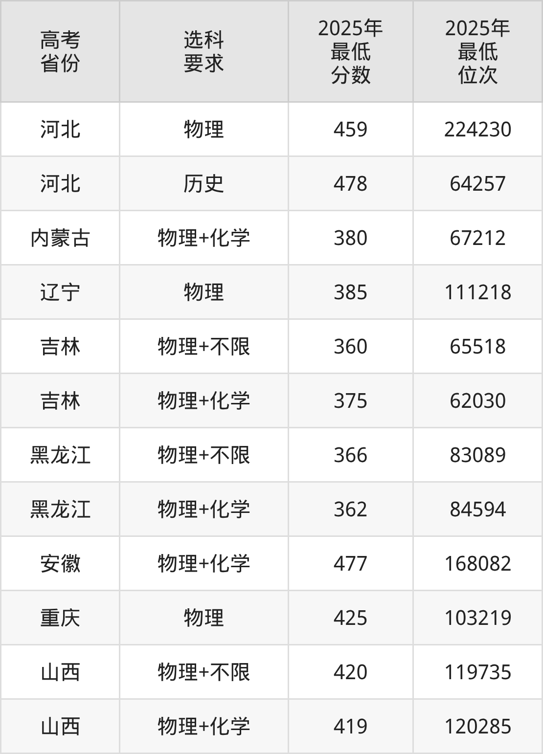 在2025年河北高考物理类招生时,公办本科收分最低的是兴安职业技术大学,最低分是286分、位次是349891位。再看河北工程技术学院,2025年在河北物理类的最低录取分数线是459分,最低位次是224230位。