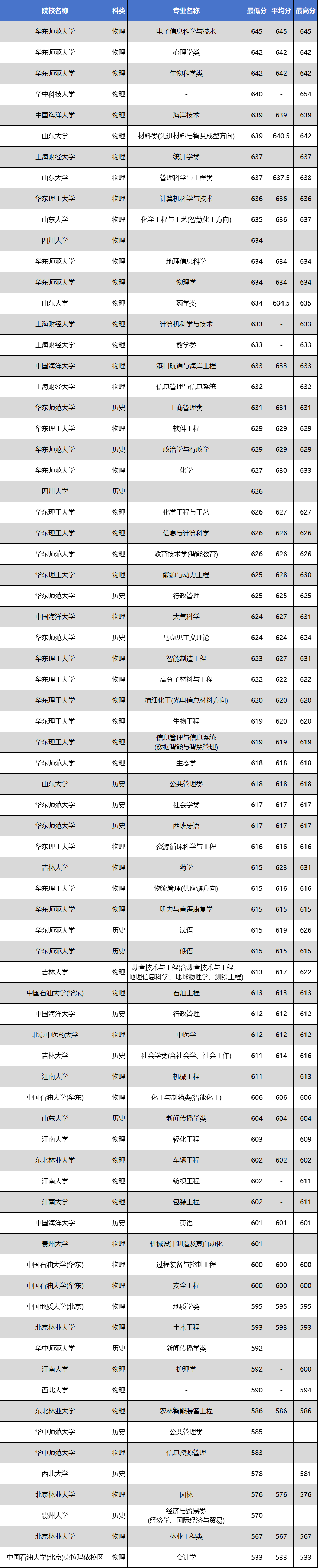 例如对物理类考生来说,华东师范大学电子信息科学与技术专业录取分数线为645分、地理信息科学634分,山东大学化学工程与工艺(智慧化工方向)专业录取分数线为635分。