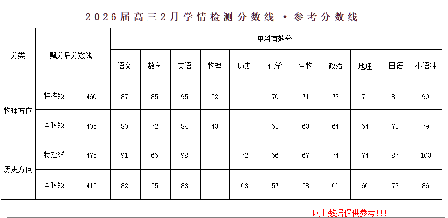 2026届安徽A10联盟高三2月学情检测分数线分别是:物理类特控线划定为460分,本科线为405分;历史类特控线划定为475分,本科线为415分。除总分划线外,本次还公布了各单科有效分,帮助考生精准找到学科短板,为二轮复习提供数据支撑。
