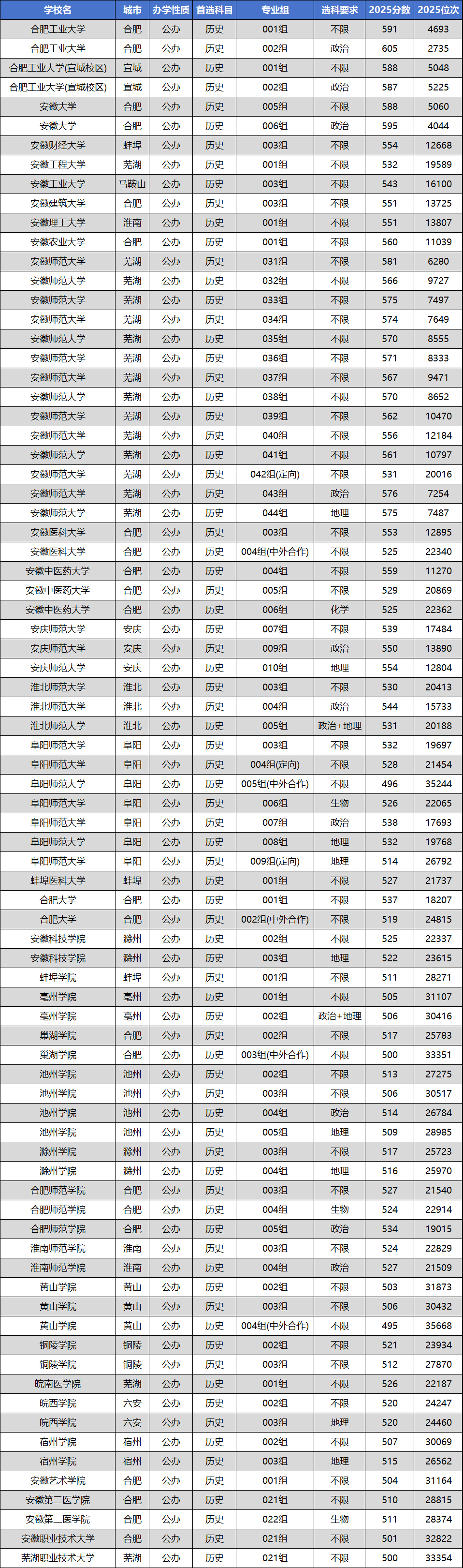 安徽师范大学:物理类不限选科组多在536-586分之间,历史类031组(不限)581分,但部分定向招生组低至531分。