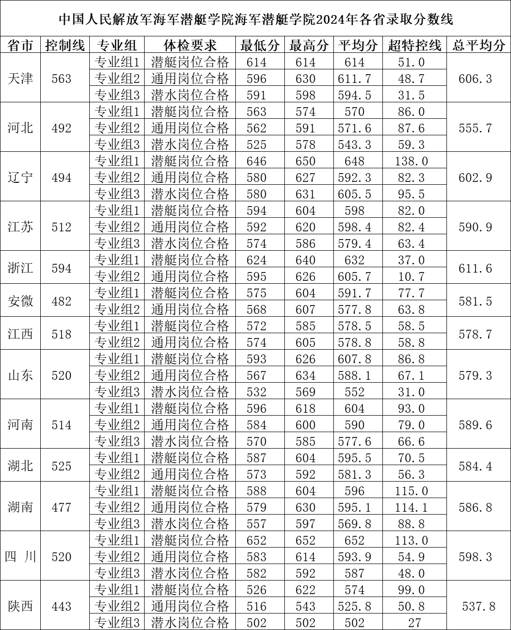 海军潜艇学院2024年在招生时,其中最低录取分数线是陕西502分,最高分数线是四川652分。