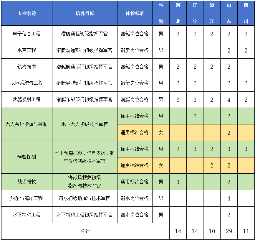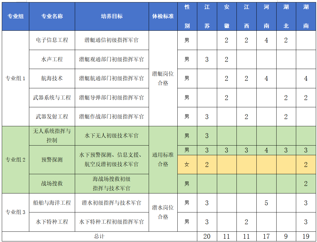 招生专业包括:电子信息工程、水声工程、航海技术、武器系统与工程、武器发射工程、无人系统指挥与控制、预警探测、战场搜救、船舶与海洋工程、水下特种工程。
