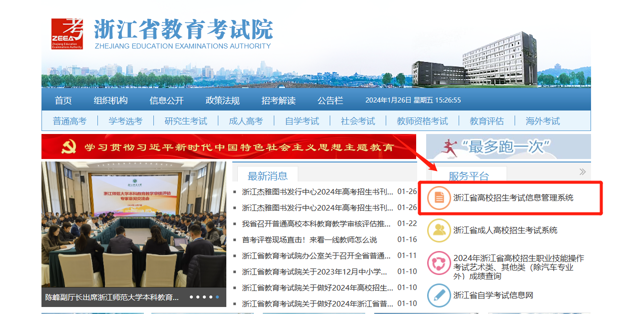 考生可点击链接进入官网首页,在右侧“服务平台”栏目中选择“浙江省高校招生考试信息管理系统”,输入证件号、密码及验证码后即可查询成绩。