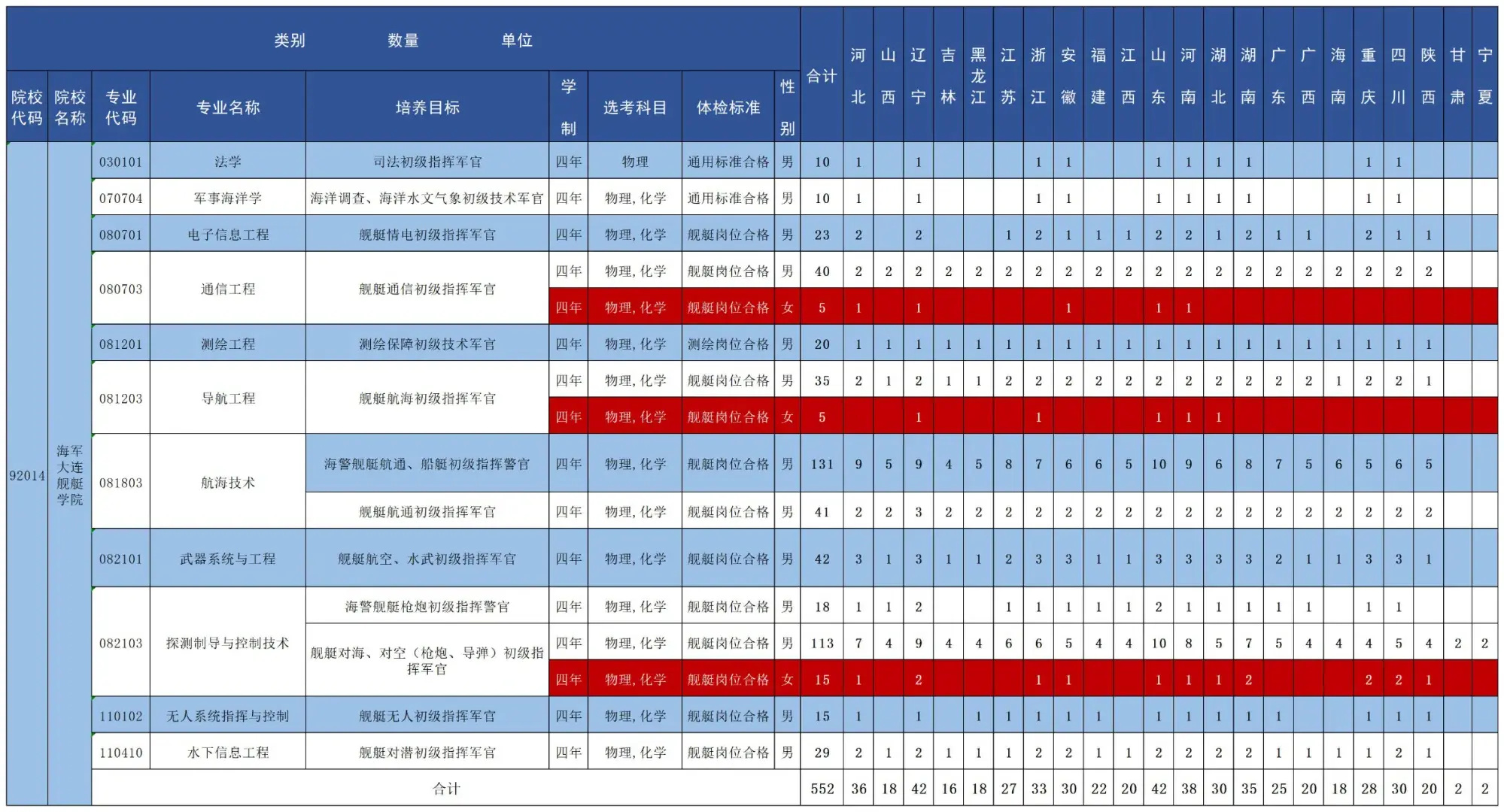 海军大连舰艇学院招生计划全部为生长军官本科学员(有军籍),面向全国部分省份招生。参考2025年该校总招生计划为552人(含少量女生),招生省份包括河北、辽宁、吉林、黑龙江、江苏、浙江、安徽、福建、江西、山东、河南、湖北、湖南、广东、广西、海南、重庆、四川、陕西、甘肃、宁夏等。