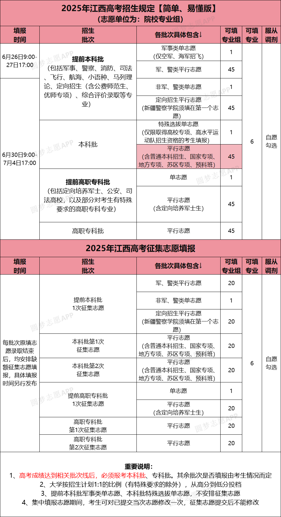 2026年江西本科提前批军事类、本科提前批(非军、警类)、高职专科提前批的录取规则是单志愿;江西本科提前批(军、警类)、本科提前批定向招生、高职专科提前批定向培养军士生的录取规则是平行志愿。下文将为大家详解!