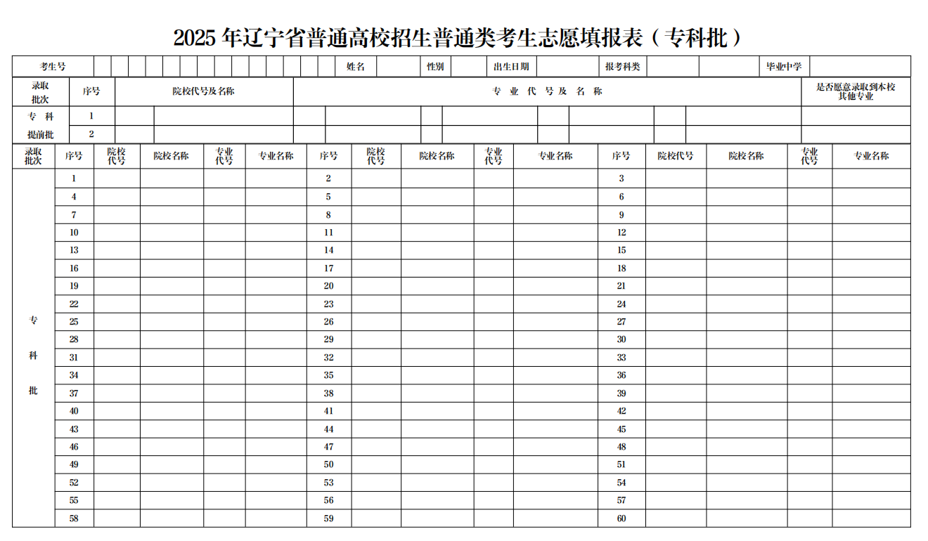 辽宁普通类专科批同样采用“专业(类)+学校”的平行志愿模式,但考生可填报的志愿数量为 60个。投档规则与本科批一致,依据“位次优先、遵循志愿、一次投档”的原则进行。