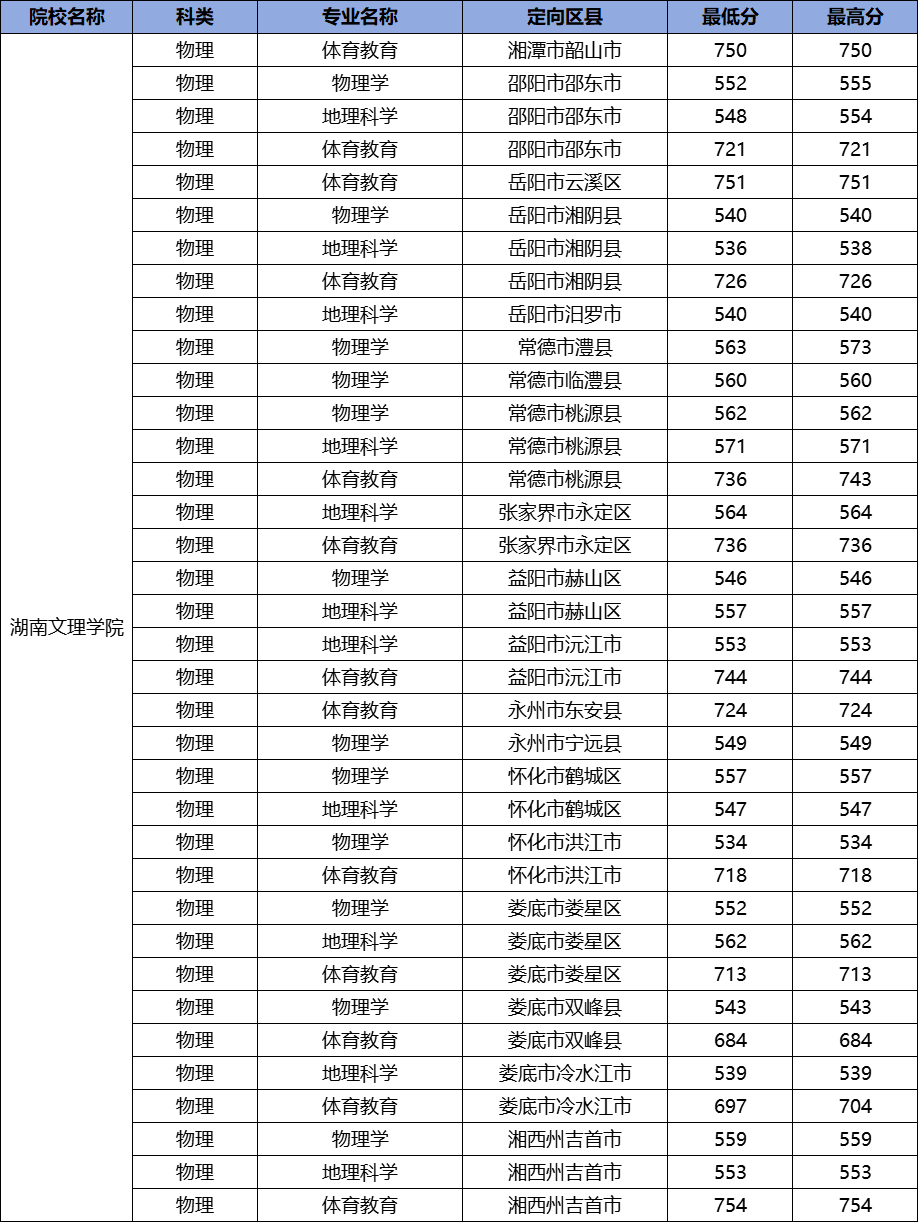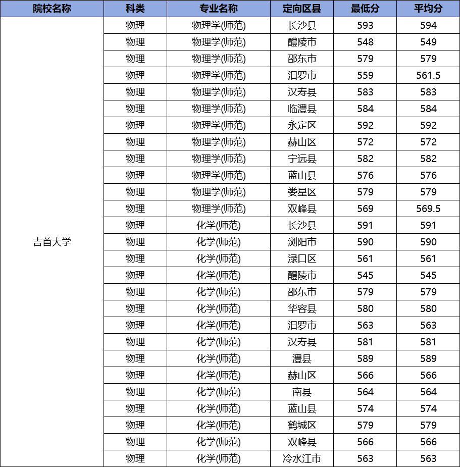 吉首大学公费师范生面向汉寿县,物理学(师范)最低分583分、化学(师范)最低分581分。