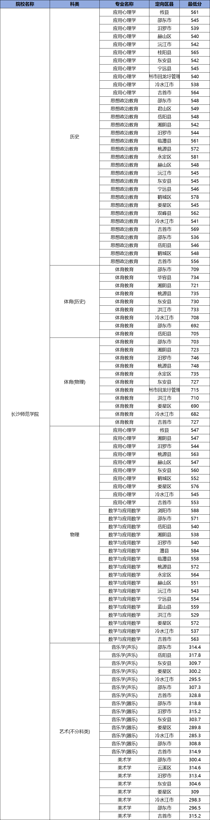 在2024年湖南高考中,长沙师范学院公费师范生面向赫山区,思想政治教育最低分548分、应用心理学最低540分、数学与应用数学最低551分。