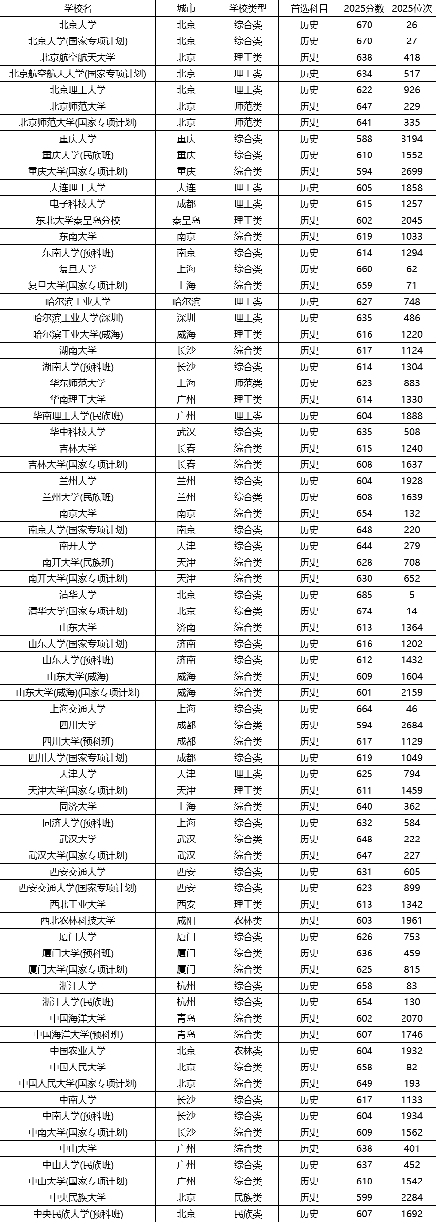 这一区间包括清华大学(685分)、北京大学(670分)、复旦大学(660分)、上海交通大学(664分)、南京大学(654分)、中国人民大学(658分) 等。这些学校历史类录取位次普遍在全省前200名以内,例如清华大学位次仅5名,北京大学位次26名。
