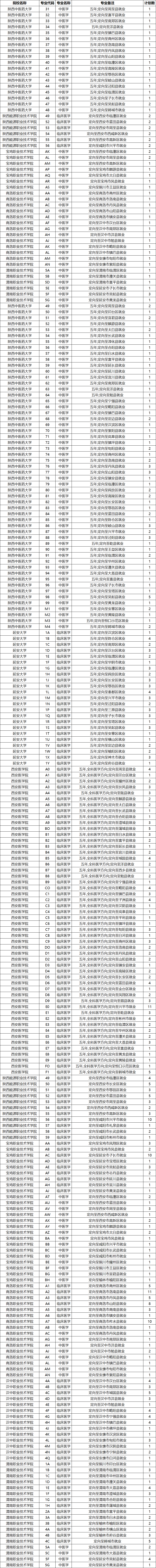 2025年陕西定向医学生招生计划为530人,其中宝鸡市12人、汉中市41人、商洛市50人、铜川市5人等,具体招生计划如下: