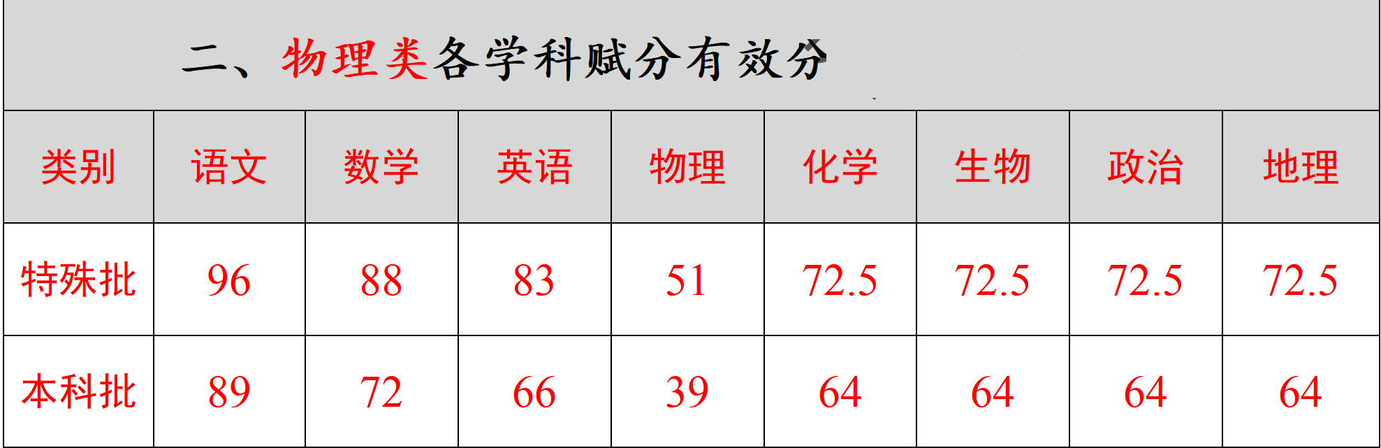 语数外总分≥96分,物理≥88分;再选科目(化/生/政/地)赋分均需≥72.5分(对应原始分在55.5-64分之间)。