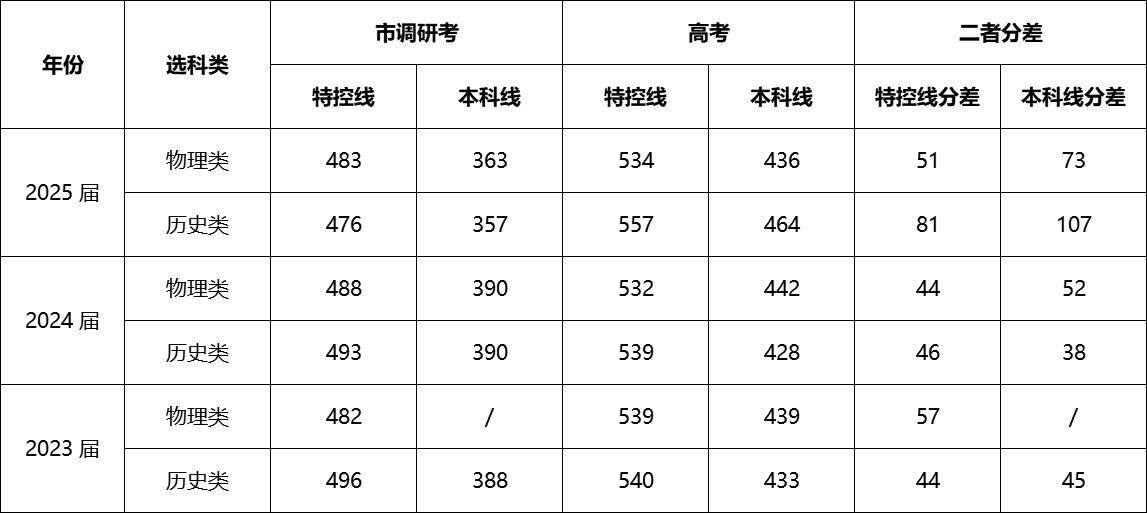 2025届:物理类特控线分差51分,本科线分差73分;历史类特控线分差81分,本科线分差107分。