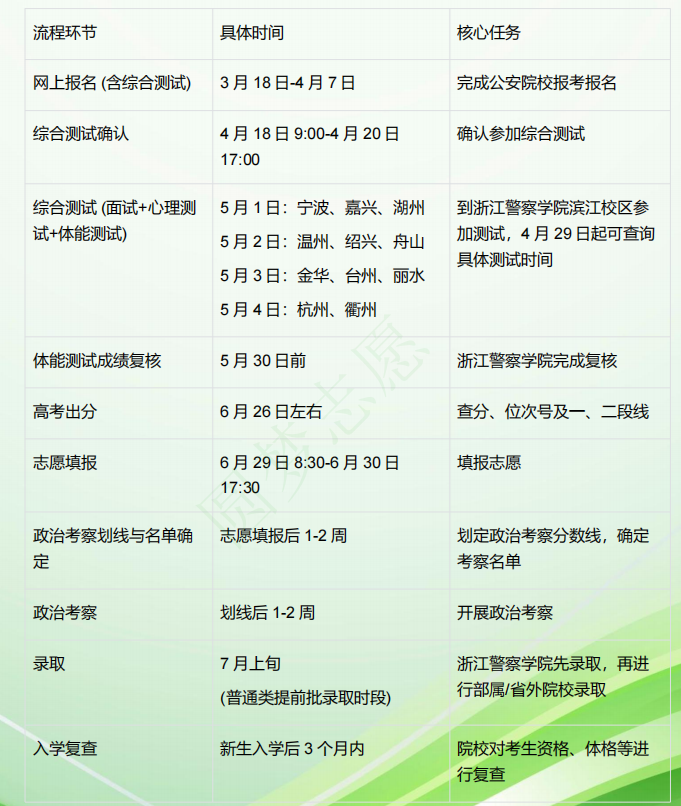 浙江警校报考流程贯穿上半年,考生需密切关注各时间节点(以下时间基于往年安排,2026年请以官方公告为准):
