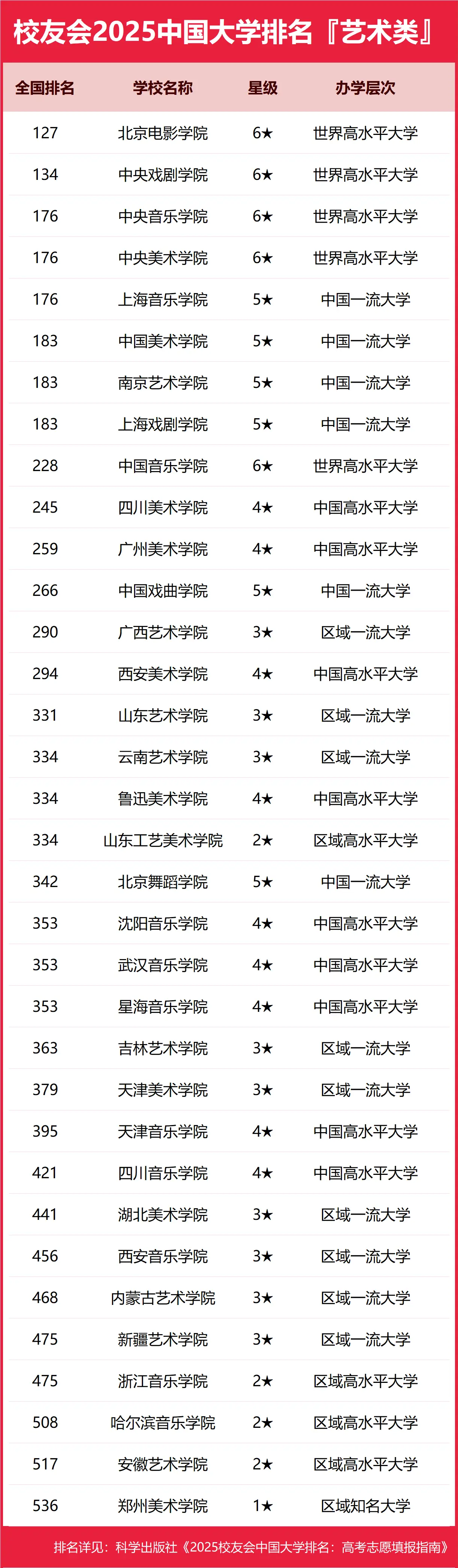 2025年校友会对全国艺术类院校进行了排名,其中排名前五的院校分别是: