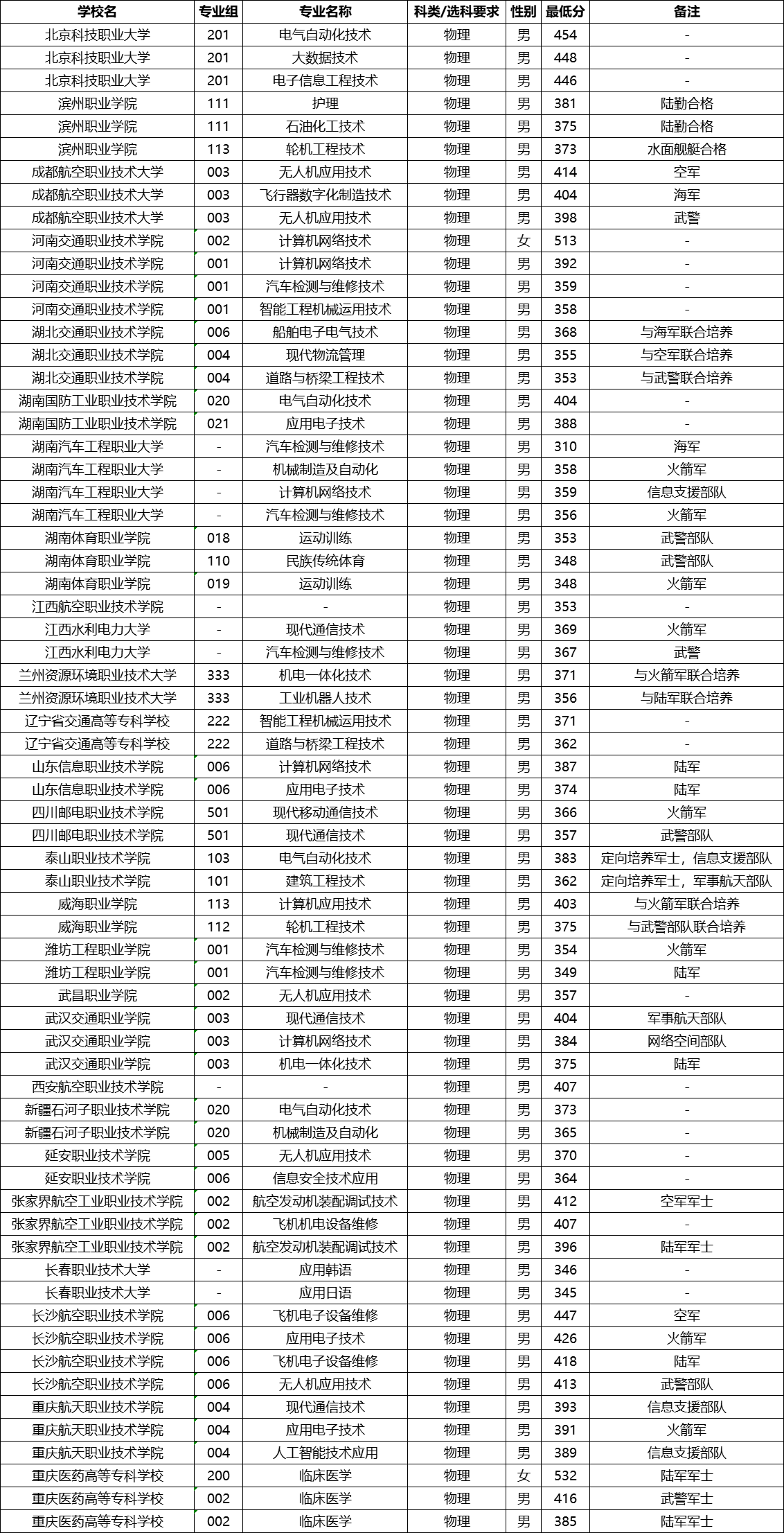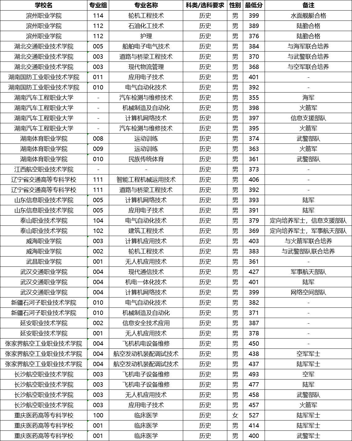 备注中显示,多所院校与各军种联合培养或定向输送。例如,湖北交通职业技术学院的船舶电子电气技术与海军联合培养,历史类男生录取分384分;道路与桥梁工程技术与武警联合培养为370分;现代物流管理与空军联合培养为368分。