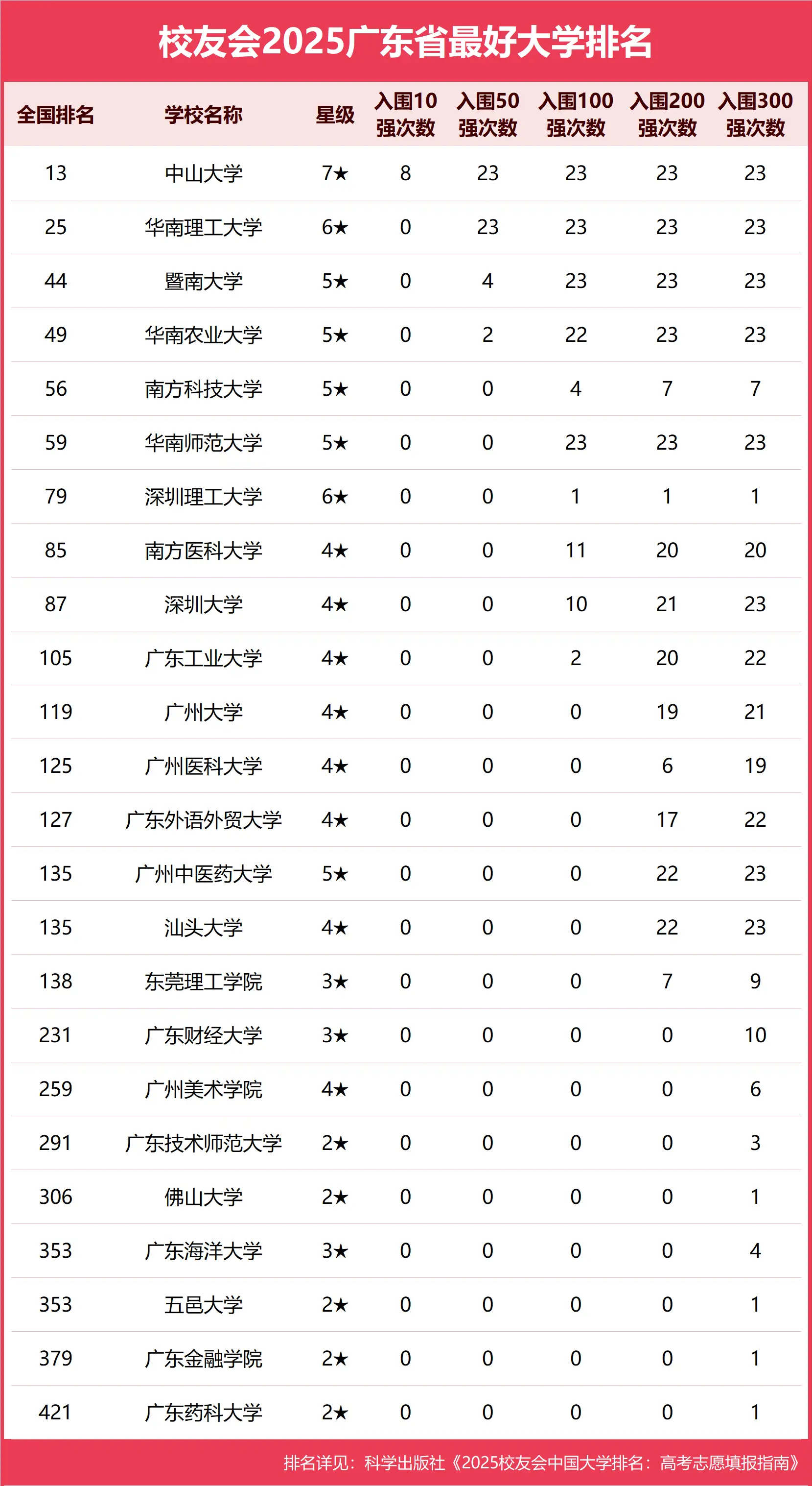 (一)校友会版榜单:广东省排名前十的名牌大学