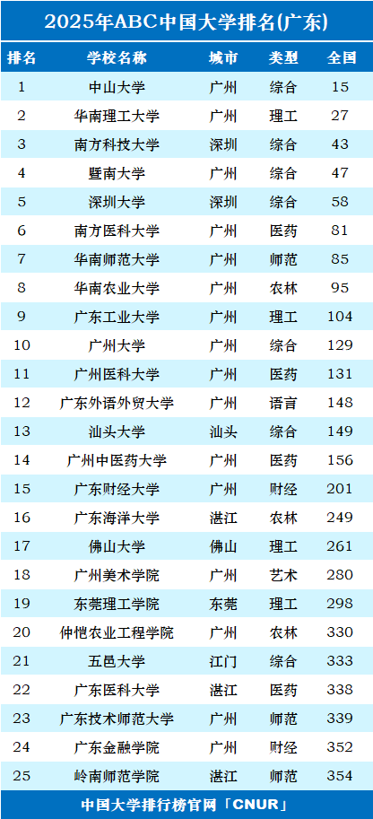(三)ABC版榜单:广东省排名前十的名牌大学