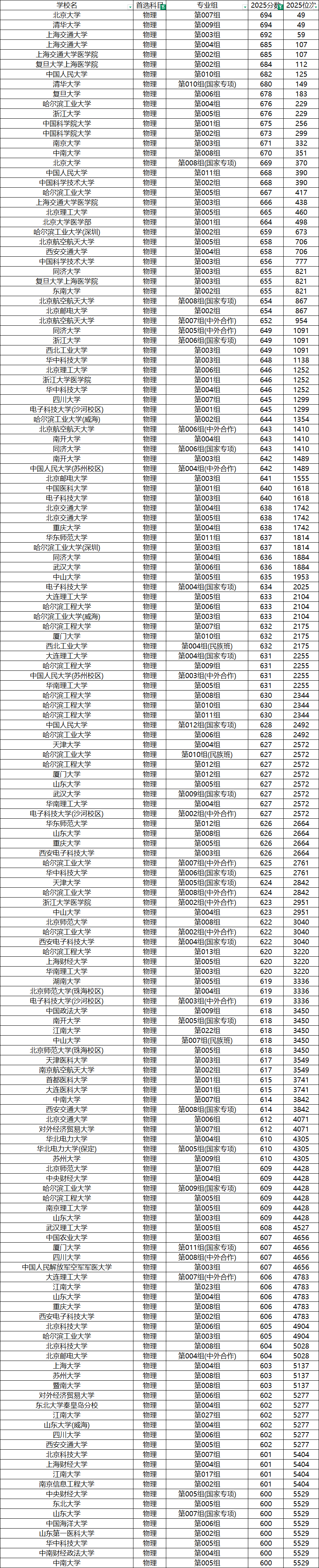 物理类作为招生大户,从顶尖名校到省内普通本科,呈现出清晰的分数梯队。