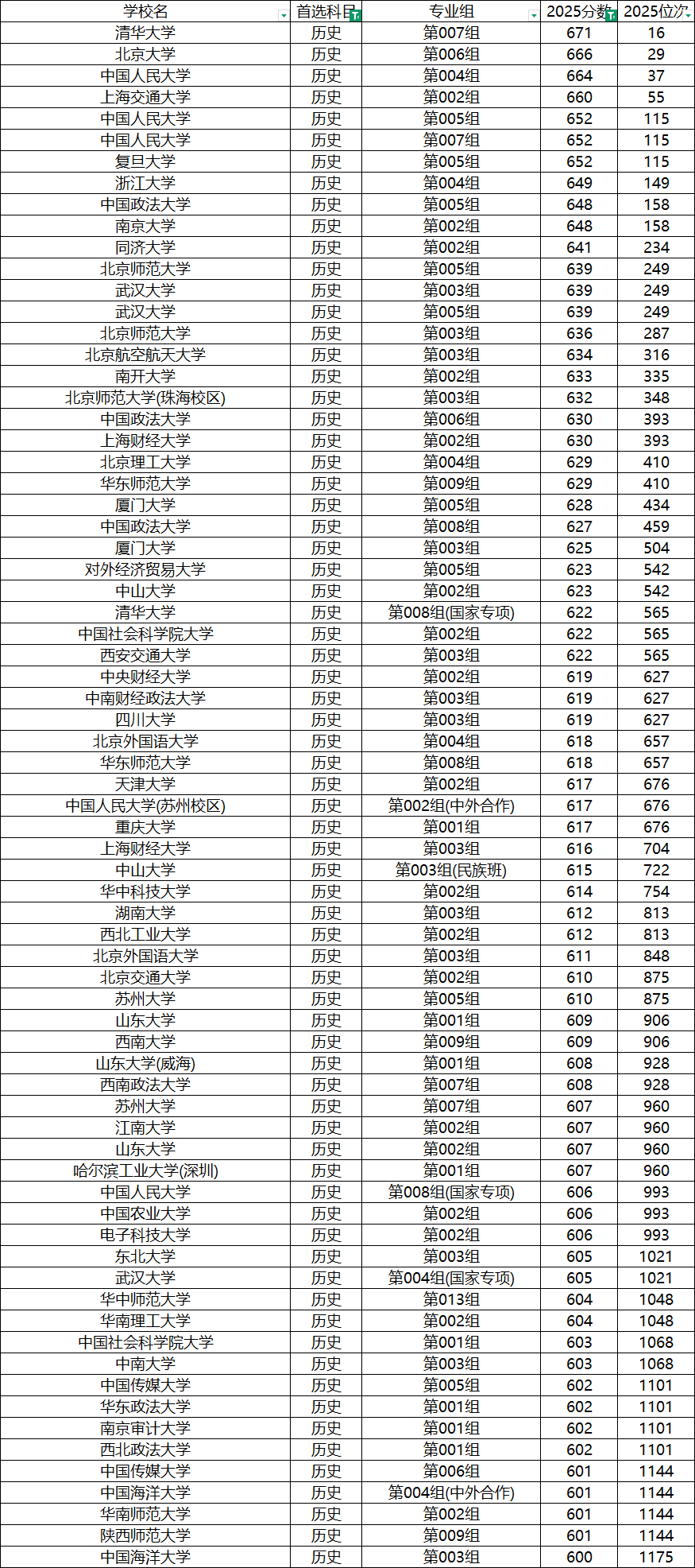 中分段(580-610分): 这个分数段是历史类考生的“兵家必争之地”,包含了大量的985、211院校的冷门专业、中外合作办学以及优秀的双非院校。例如厦门大学(第003组) 为625分,中山大学(第002组) 为623分,四川大学(第003组) 为619分,中国传媒大学(第005组) 为602分。