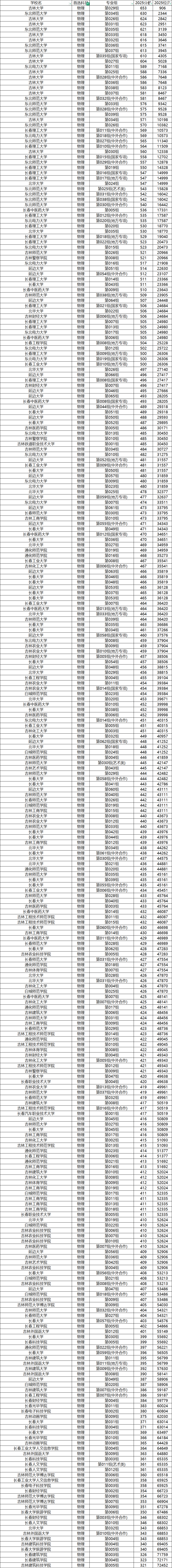 一、2025年全国本科院校在吉林物理类录取分数线
