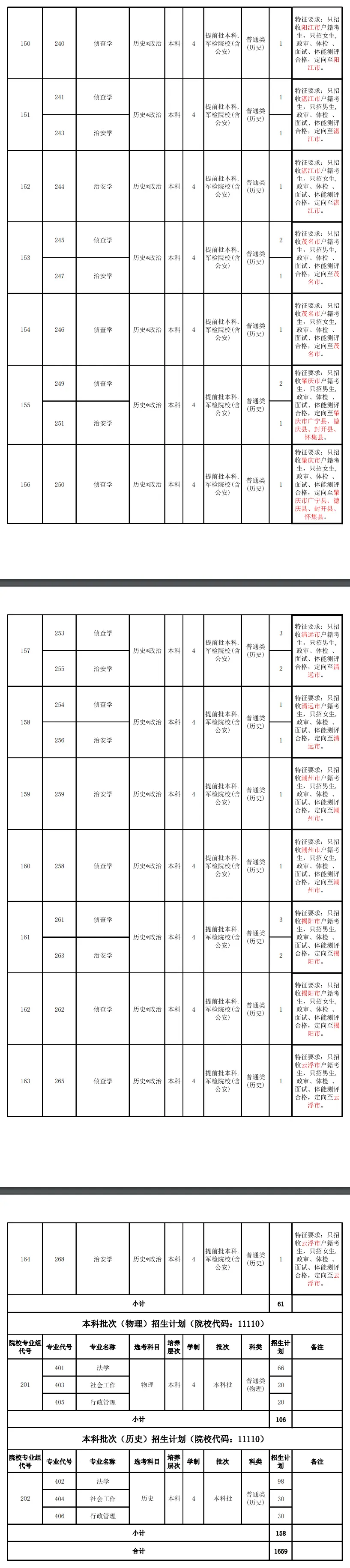 提前批公安专业:约1500人,全部面向广东招生,分为普通招生计划和专项培养计划(定向至特定地市)