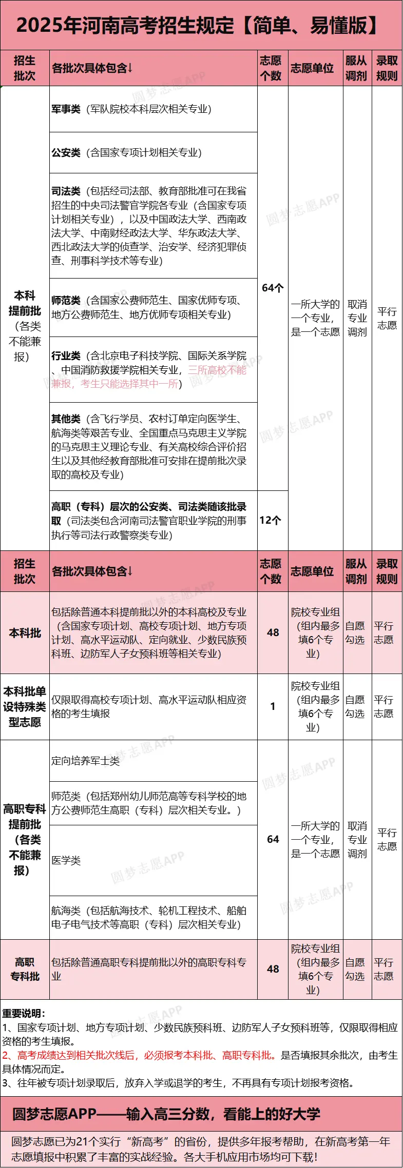 2026年河南高考志愿填报分为普通类、艺术类和体育类,按批次顺序依次进行录取。普通类本科批与高职(专科)批均设置48个院校专业组平行志愿,为考生提供系统化的专业选择;本科提前批与高职(专科)提前批则各设64个“专业+院校”平行志愿,聚焦特殊招生类型。