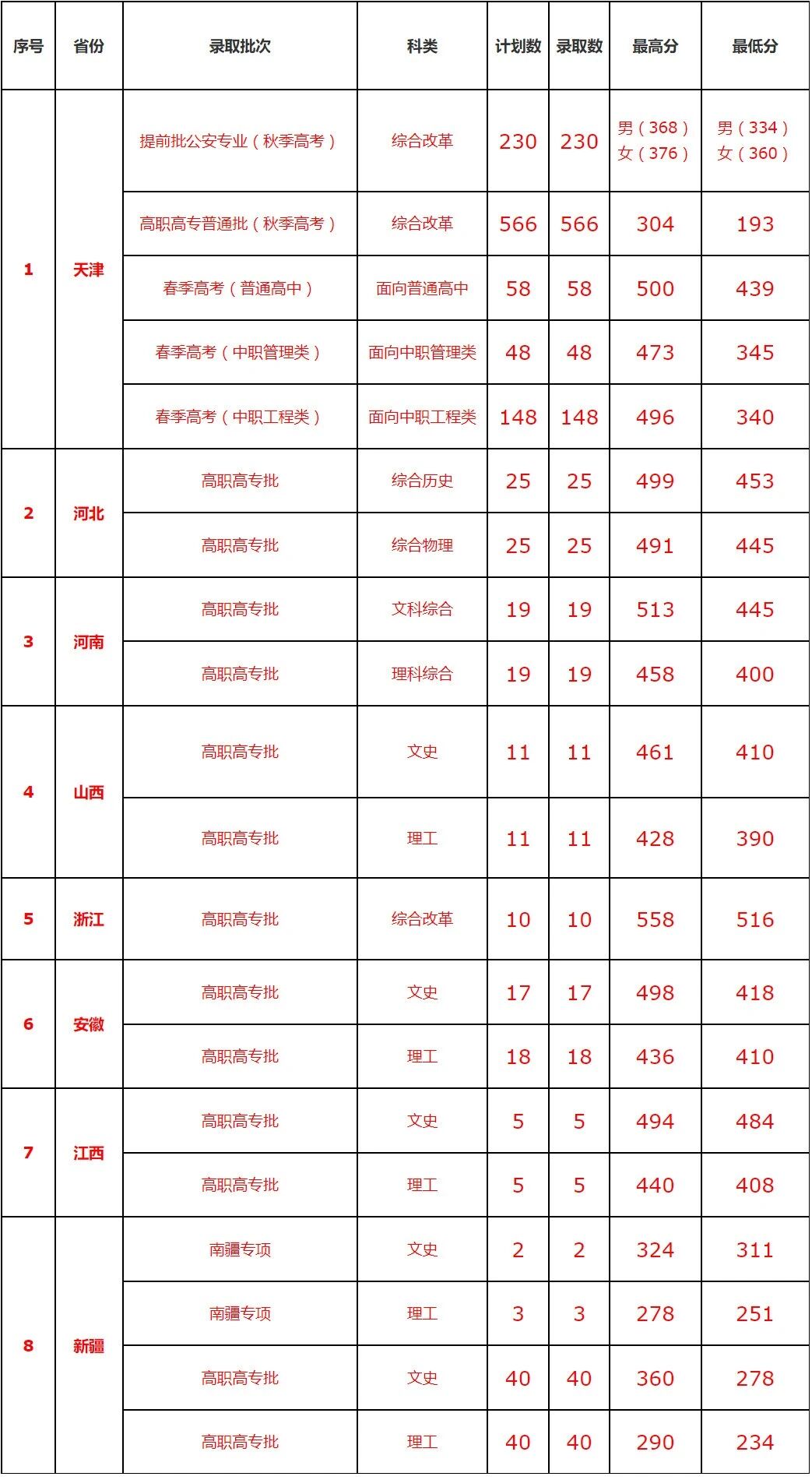2025年,天津警察学院仅在专科层次招生,涵盖公安类专业和普通类专业,招生区域包括天津、河北、河南、山西、浙江、安徽、江西、新疆等8个省份。以下是各省录取情况: