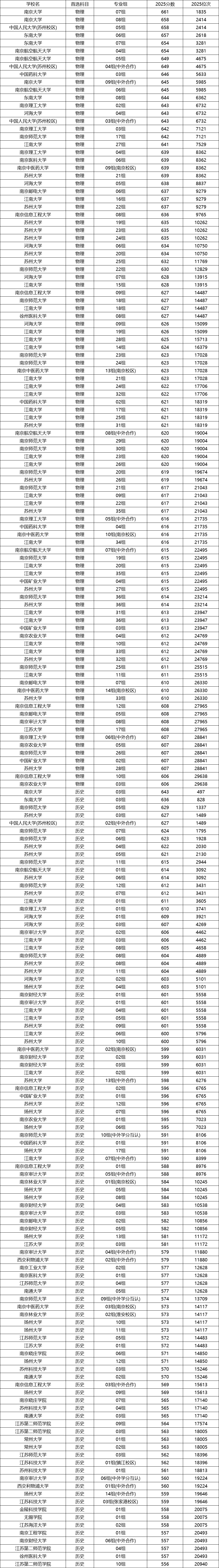 在此根据江苏教育考试院发布的2025年江苏本科投档情况统计表,整理了各大学在江苏物理类和历史类的分数线情况。