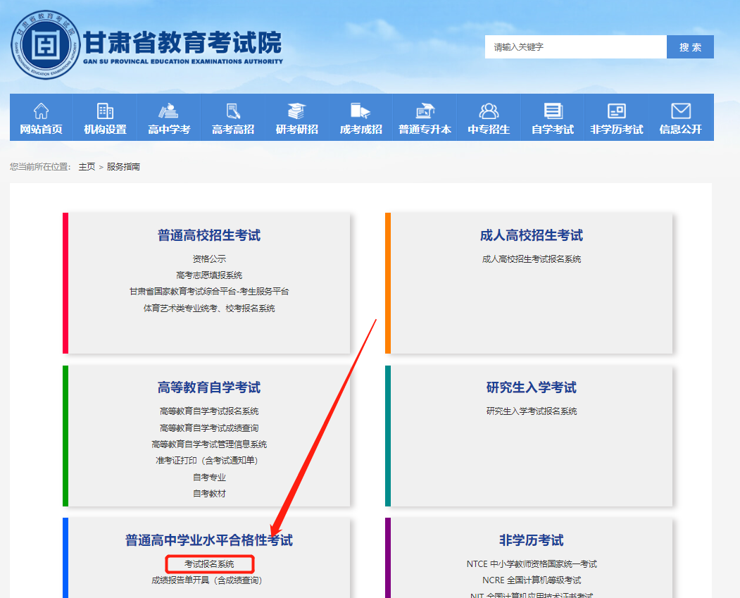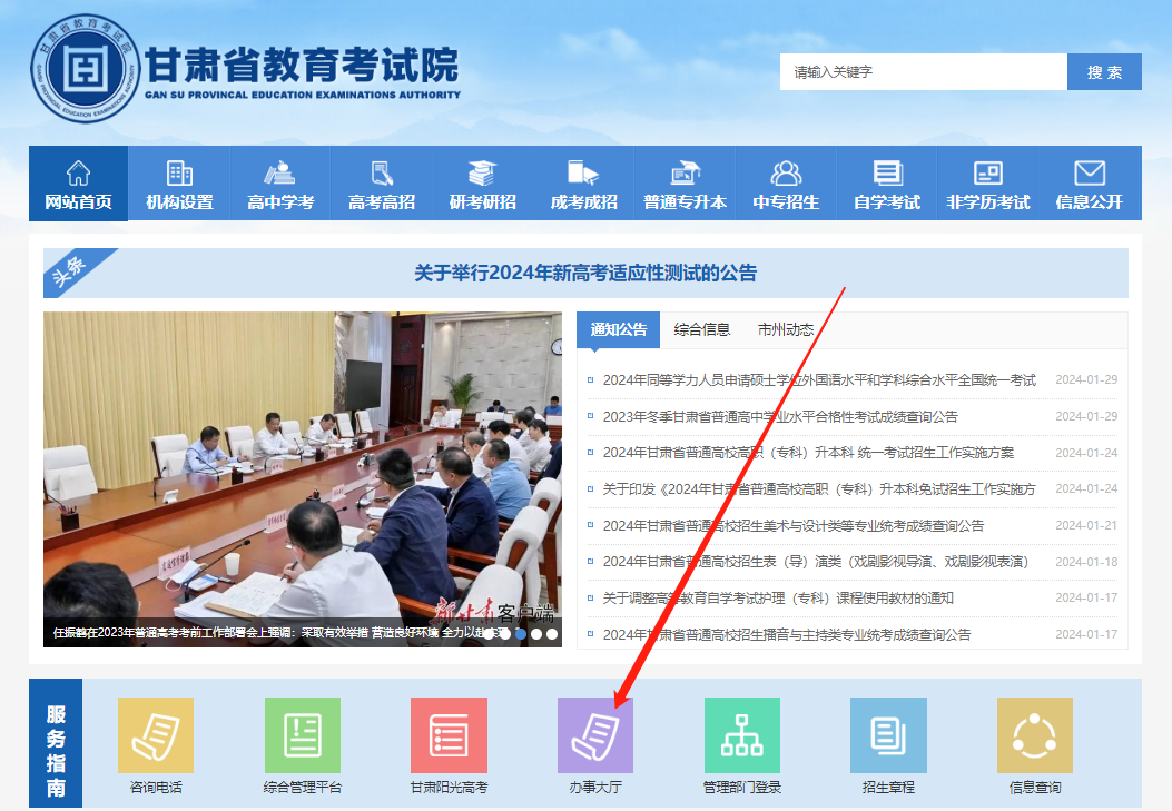 第一步:在甘肃省教育考试院官网服务指南栏目找到办事大厅进入。