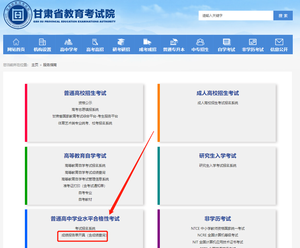 2024年2月19日起考生可登录甘肃省教育考试院官网,通过“办事大厅-普通高中学业水平合格性考试-成绩报告单开具(含成绩查询)”,输入本人身份证号码及姓名查询已参加过的合格性考试科目成绩。