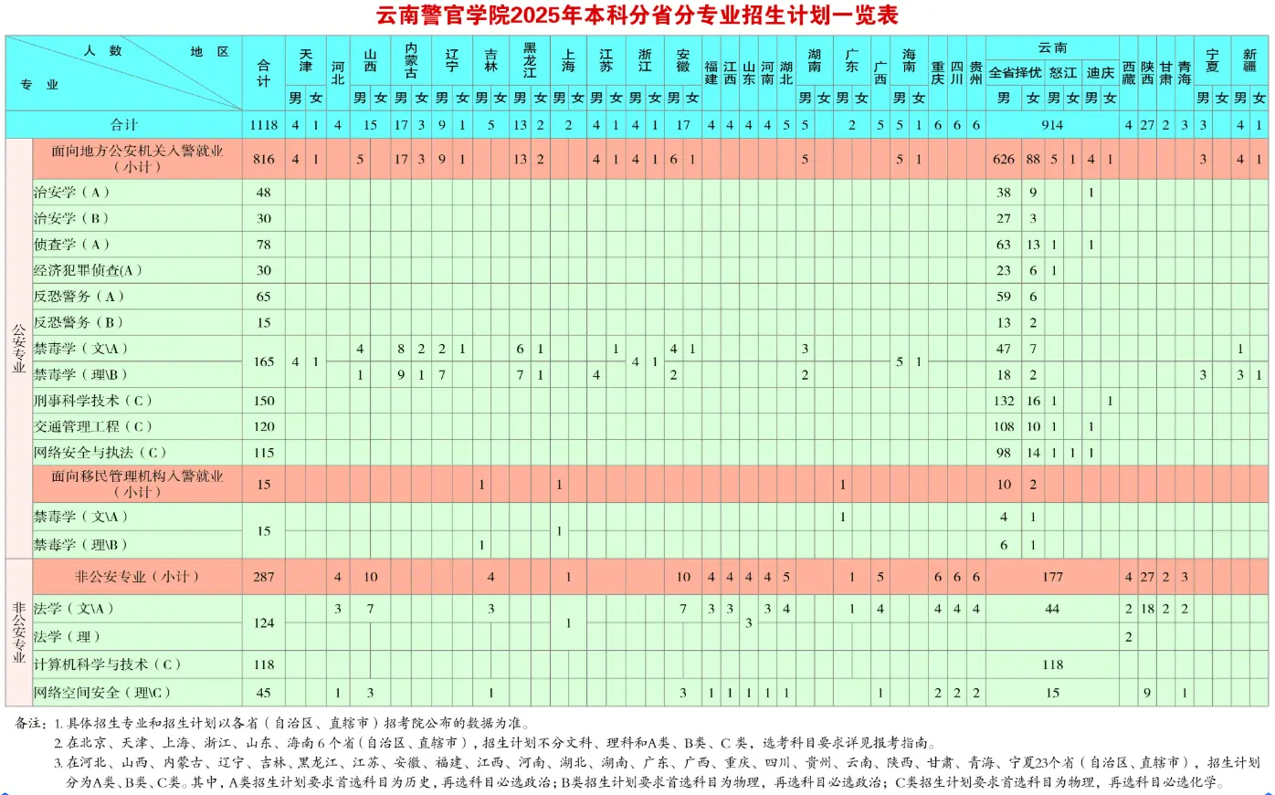 云南警官学院招生计划分为面向地方公安机关入警就业、面向移民管理机构入警就业和非公安专业三大类。参考2025年该校总招生计划为1118人,其中: