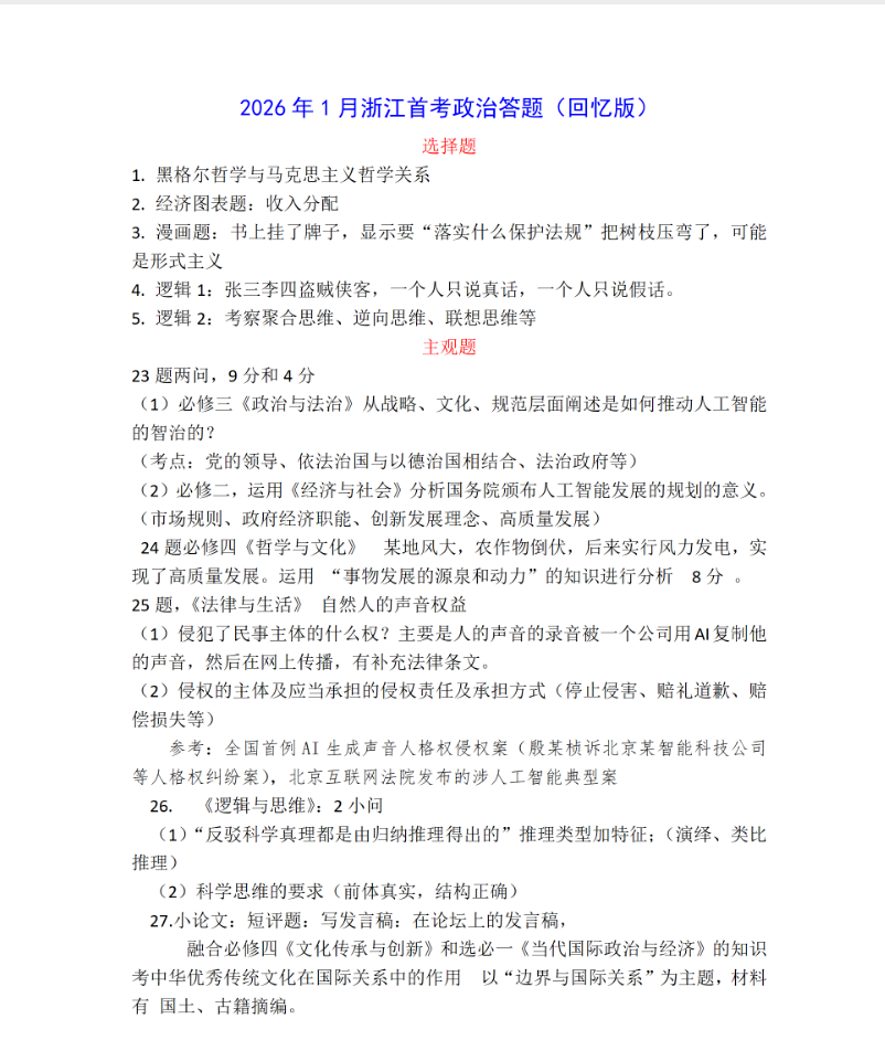 试题紧密结合人工智能、法治实践等时代议题,强调知识整合与表达逻辑。参考答案将逐步整理发布。