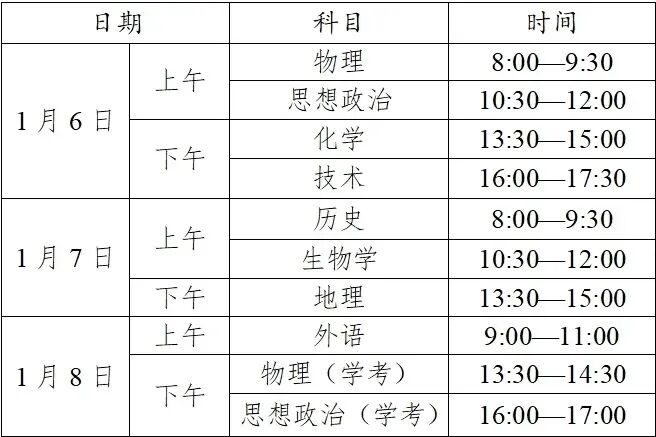 2026年1月选考与学考已于1月6日至8日进行,具体科目时间如下: