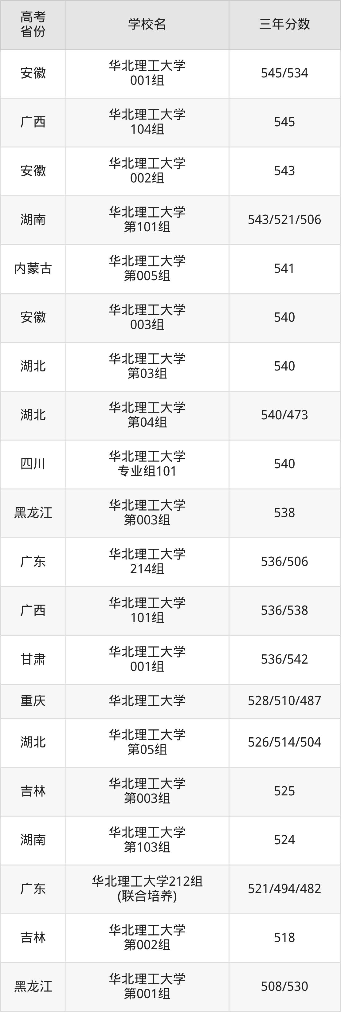 | 华北理工大学 (少数民族预科班) | 544 | 529 | 508 |
